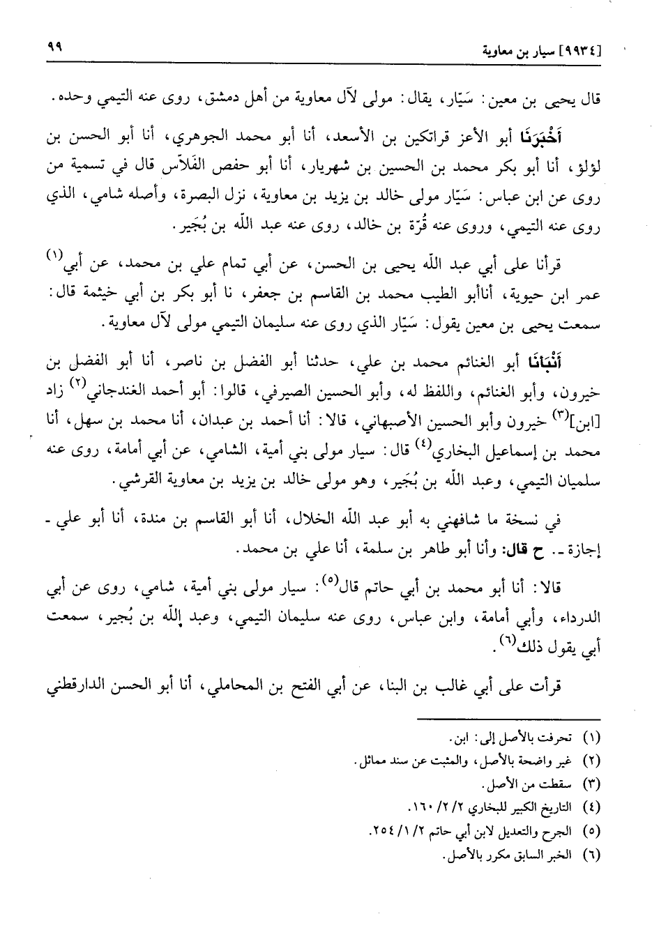 سمعت يحيى بن معين يقول: سيّار الذي روى عنه سليمان التيمي مولى لآل معاوية. أنبأنا أبو الغنائم محمد بن علي، حدثنا أبو الفضل بن ناصر، أنا أبو الفضل بن خيرون، وأبو الغنائم، واللفظ له، وأبو الحسين الصيرفي، قالوا: أبو أحمد الغندجاني «2» زاد [ابن] «3» خيرون وأبو الحسين الأصبهاني، قالا: أنا أحمد بن عبدان، أنا محمد بن سهل، أنا محمد بن إسماعيل البخاري «4» قال: سيار مولى بني أمية، الشامي، عن أبي أمامة، روى عنه سلميان التيمي، وعبد الله بن بجير، وهو مولى خالد بن يزيد بن معاوية القرشي.