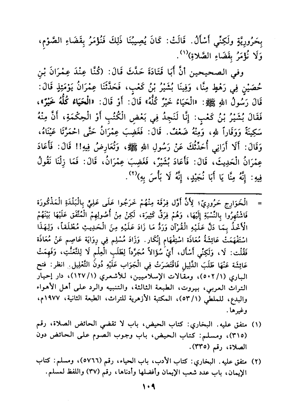 وفي الصحيحين أَنَّ أَبَا قَتَادَةَ حَدَّثَ قَالَ: كُنَّا عِنْدَ عِمْرَانَ بْنِ حُصَيْنٍ فِي رَهْطٍ مِنَّا، وَفِينَا بُشَيْرُ ابْنُ كَعْبٍ فَحَدَّثَنَا عِمْرَانُ يَوْمَئِذٍ قَالَ: قَالَ رَسُولُ اللَّهِ (صلى الله عليه وسلم) «الْحَيَاءُ خَيْرٌ كُلُّهُ» قَالَ: أَوْ قَالَ: «الْحَيَاءُ كُلُّهُ خَيْرٌ» فَقَالَ بُشَيْرُ بْنُ كَعْبٍ: إِنَّا لَنَجِدُ فِي بَعْضِ الْكُتُبِ أَوْ الْحِكْمَةِ، أَنَّ مِنْهُ سَكِينَةً وَوَقَارًا لِلَّهِ، وَمِنْهُ ضَعْفٌ. قَالَ: فَغَضِبَ عِمْرَانُ حَتَّى احْمَرَّتَا عَيْنَاهُ، وَقَالَ: أَلَا أَرَانِي أُحَدِّثُكَ عَنْ رَسُولِ اللَّهِ (صلى الله عليه وسلم) وَتُعَارِضُ فِيهِ. قَالَ: فَأَعَادَ عِمْرَانُ الْحَدِيثَ، قَالَ: فَأَعَادَ بُشَيْرٌ، فَغَضِبَ عِمْرَانُ قَالَ: فَمَا زِلْنَا نَقُولُ فِيهِ: إِنَّهُ مِنَّا يَا أَبَا نُجَيْدٍ، إِنَّهُ لَا بَأْسَ بِهِ) (¬2) .