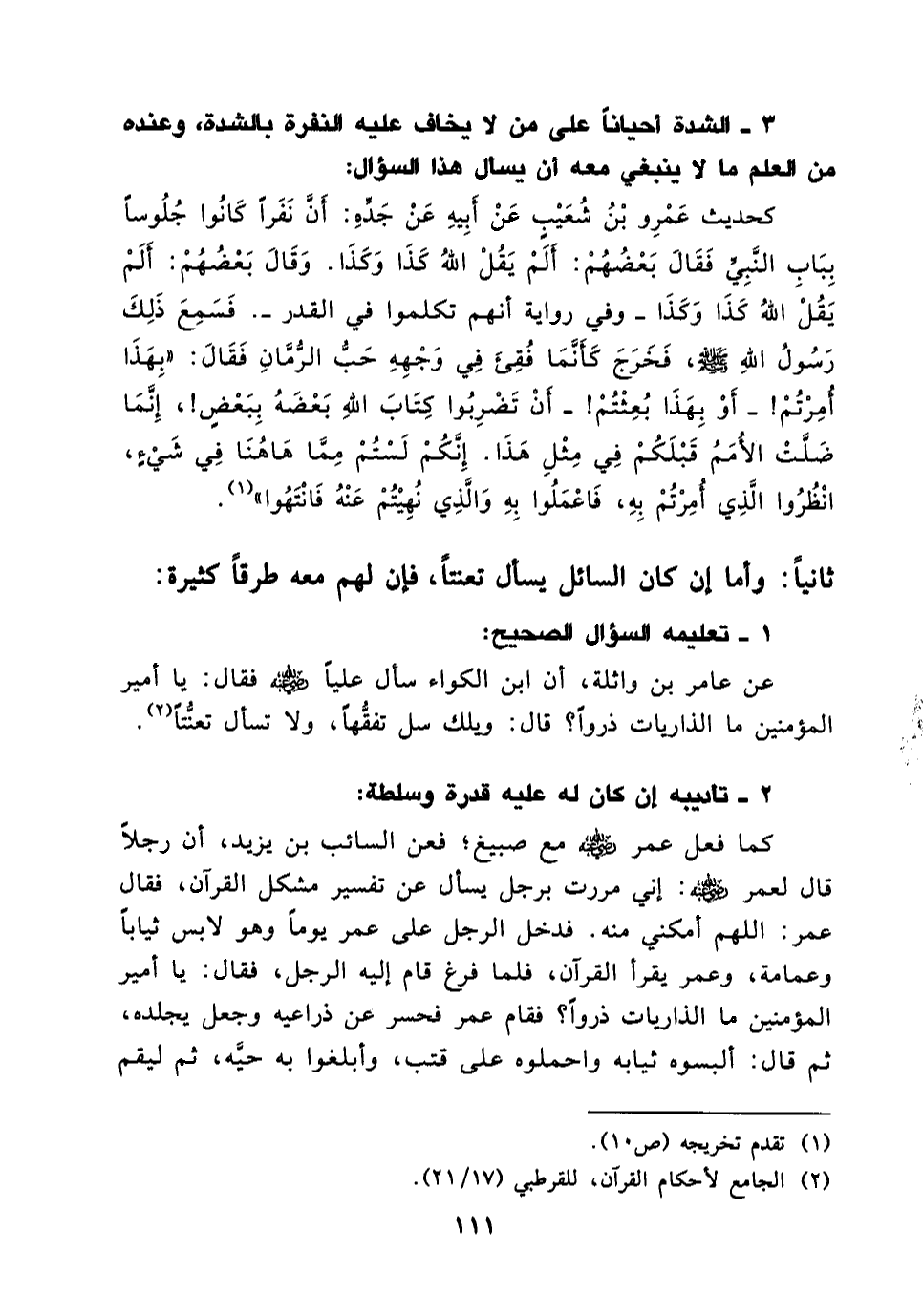 3- الشدة أحيانا على من لا يخاف عليه النفرة بالشدة، وعنده من العلم ما لا ينبغي معه أن يسأل هذا السؤال؛ كحديث عَمْرِو بْنِ شُعَيْبٍ عَنْ أَبِيهِ عَنْ جَدِّهِ: أَنَّ نَفَرًا كَانُوا جُلُوسًا بِبَابِ النَّبِيِّ فَقَالَ بَعْضُهُمْ: أَلَمْ يَقُلْ اللَّهُ كَذَا وَكَذَا. وَقَالَ بَعْضُهُمْ: أَلَمْ يَقُلْ اللَّهُ كَذَا وَكَذَا -وفي رواية أنهم تكلموا في القدر- فَسَمِعَ ذَلِكَ رَسُولُ اللَّهِ (صلى الله عليه وسلم) ، فَخَرَجَ كَأَنَّمَا فُقِئَ فِي وَجْهِهِ حَبُّ الرُّمَّانِ فَقَالَ: «بِهَذَا أُمِرْتُمْ - أَوْ بِهَذَا بُعِثْتُمْ - أَنْ تَضْرِبُوا كِتَابَ اللَّهِ بَعْضَهُ بِبَعْضٍ، إِنَّمَا ضَلَّتْ الْأُمَمُ قَبْلَكُمْ فِي مِثْلِ هَذَا، إِنَّكُمْ لَسْتُمْ مِمَّا هَاهُنَا فِي شَيْءٍ، انْظُرُوا الَّذِي أُمِرْتُمْ بِهِ، فَاعْمَلُوا بِهِ وَالَّذِي نُهِيتُمْ عَنْهُ فَانْتَهُوا» (¬1) .