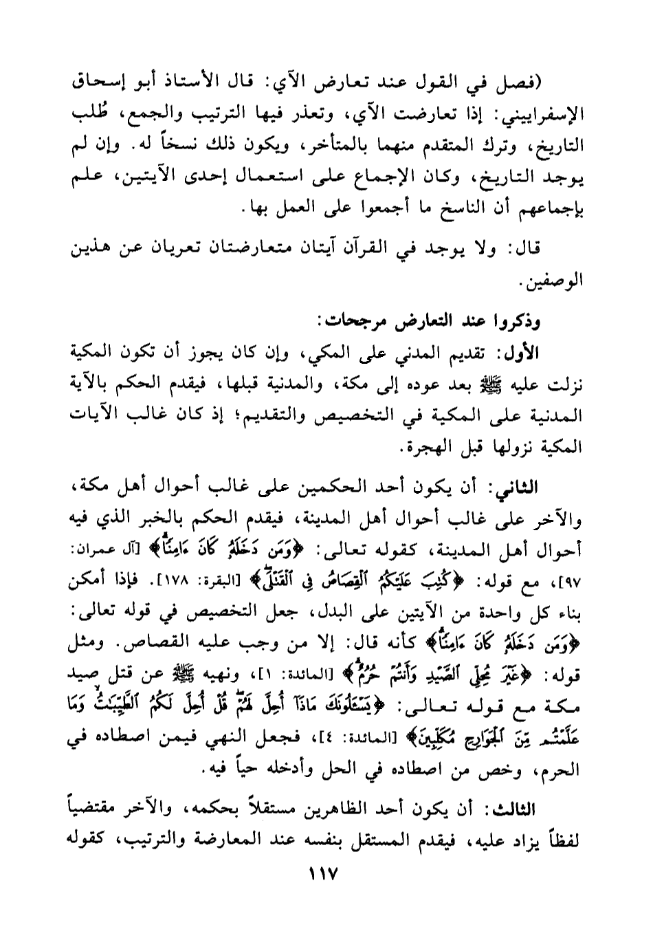 (فصل في القول عند تعارض الآي: قال الأستاذ أبو إسحاق الإسفراييني: إذا تعارضت الآي، وتعذر فيها الترتيب والجمع، طلب التاريخ، وترك المتقدم منهما بالمتأخر، ويكون ذلك نسخا له. وإن لم يوجد التاريخ، وكان الإجماع على استعمال إحدى الآيتين، علم بإجماعهم أن الناسخ ما أجمعوا على العمل بها.