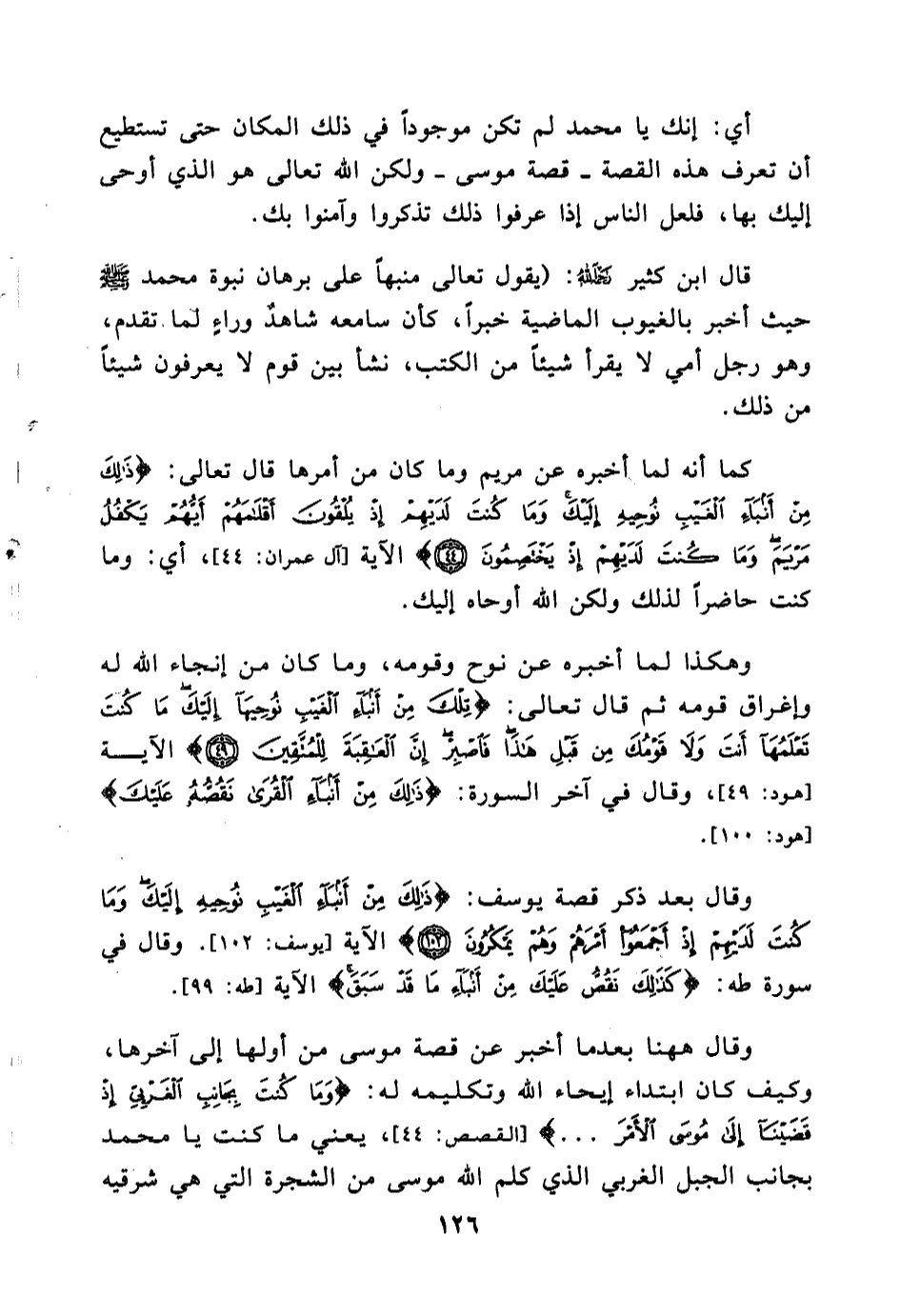 أي أنك يا محمد لم تكن موجودا في ذلك المكان حتى تستطيع أن تعرف هذه القصة -قصة موسى-ولكن الله تعالى هو الذي أوحى إليك بها، فلعل الناس إذا عرفوا ذلك تذكروا وآمنوا بك، قال ابن كثير -رحمه الله-: (يقول تعالى منبها على برهان نبوة محمد (صلى الله عليه وسلم) حيث أخبر بالغيوب الماضية خبرا كأن سامعه شاهد وراء لما تقدم وهو رجل أمي لا يقرأ شيئا من الكتب نشأ بين قوم لا يعرفون شيئا من ذلك كما أنه لما أخبره عن مريم وما كان من أمرها قال تعالى: "وما كنت لديهم إذ يلقون أقلامهم أيهم يكفل مريم وما كنت لديهم إذ يختصمون" الآية أي وما كنت حاضرا لذلك ولكن الله أوحاه إليك وهكذا لما أخبره عن نوح وقومه وما كان من إنجاء الله له وإغراق قومه ثم قال تعالى: "تلك من أنباء الغيب نوحيها إليك ما كنت تعلمها أنت ولا قومك من قبل هذا فاصبر إن العاقبة للمتقين" الآية وقال في آخر السورة "ذلك من أنباء القرى نقصه عليك" وقال بعد ذكر قصة يوسف "ذلك من أنباء الغيب نوحيه إليك وما كنت لديهم إذ أجمعوا أمرهم وهم يمكرون" الآية وقال في سورة طه "كذلك نقص عليك من أنباء ما قد سبق" الآية وقال ههنا بعدما أخبر عن قصة موسى من أولها إلى آخرها وكيف كان ابتداء إيحاء الله إليه وتكليمه له "وما كنت بجانب الغربي إذ قضينا إلى موسى الأمر" يعني ما كنت يا محمد بجانب الجبل الغربي الذي كلم الله موسى من الشجرة التي هي شرقية
