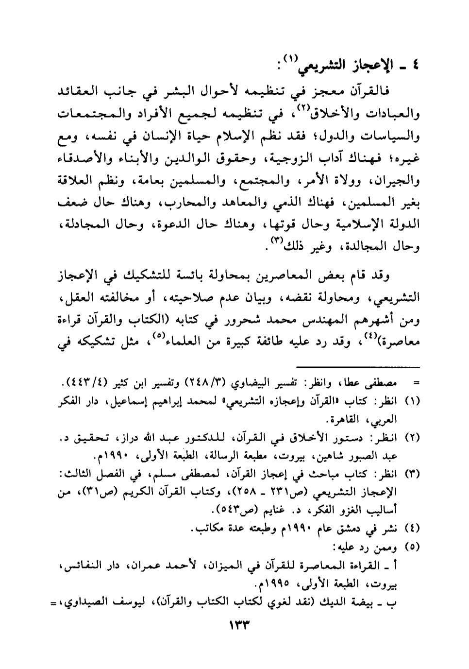 (¬3) انظر كتاب مباحث في إعجاز القرآن، لمصطفى مسلم، في الفصل الثالث: الإعجاز التشريعي، ص:231-258، وكتاب (القرآن الكريم) ص:31، من أساليب الغزو الفكر، لغنايم (ص:543) .