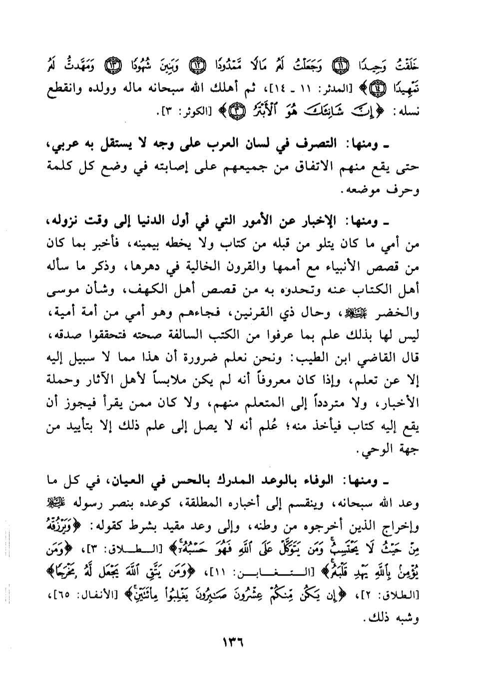 - ومنها الوفاء بالوعد المدرك بالحس في العيان، في كل ما وعد الله سبحانه، وينقسم إلى أخباره المطلقة، كوعده بنصر رسوله عليه السلام، وإخراج الذين أخرجوه من وطنه، وإلى وعد مقيد بشرط كقوله: {ومن يتوكل على الله فهو حسبه} [الطلاق: 3] {ومن يؤمن بالله يهد قلبه} [التغابن: 11] {ومن يتق الله يجعل له مخرجا} [الطلاق: 2] {إن يكن منكم عشرون صابرون يغلبوا مائتين} [الأنفال: 65] وشبه ذلك.