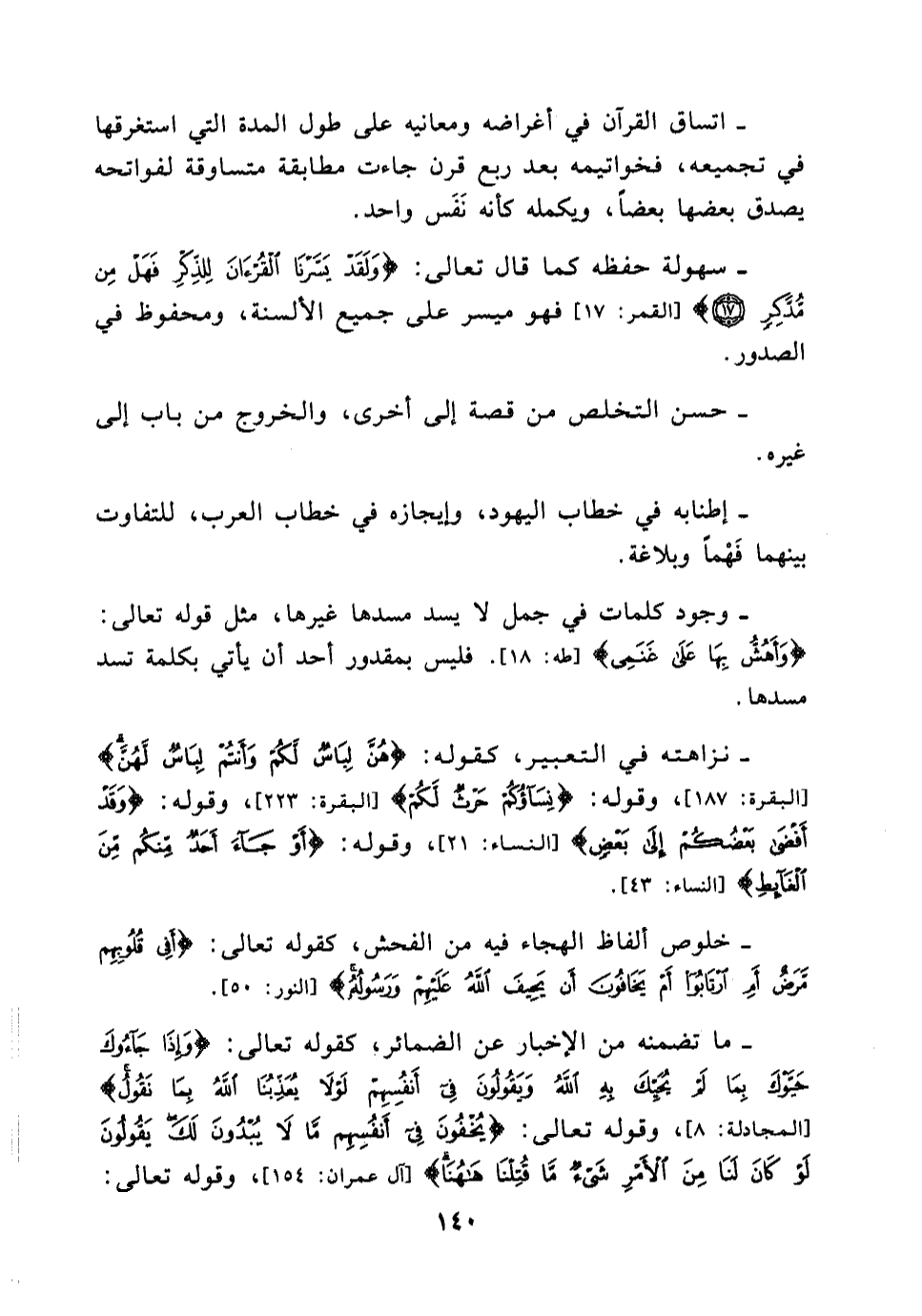 - اتساق القرآن في أغراضه ومعانيه على طول المدة التي استغرقها في تجميعه، فخواتيمه بعد ربع قرن جاءت مطابقة متساوقة لفواتحه يصدق بعضها بعضا، ويكلمه كأنه نَفَس واحد.