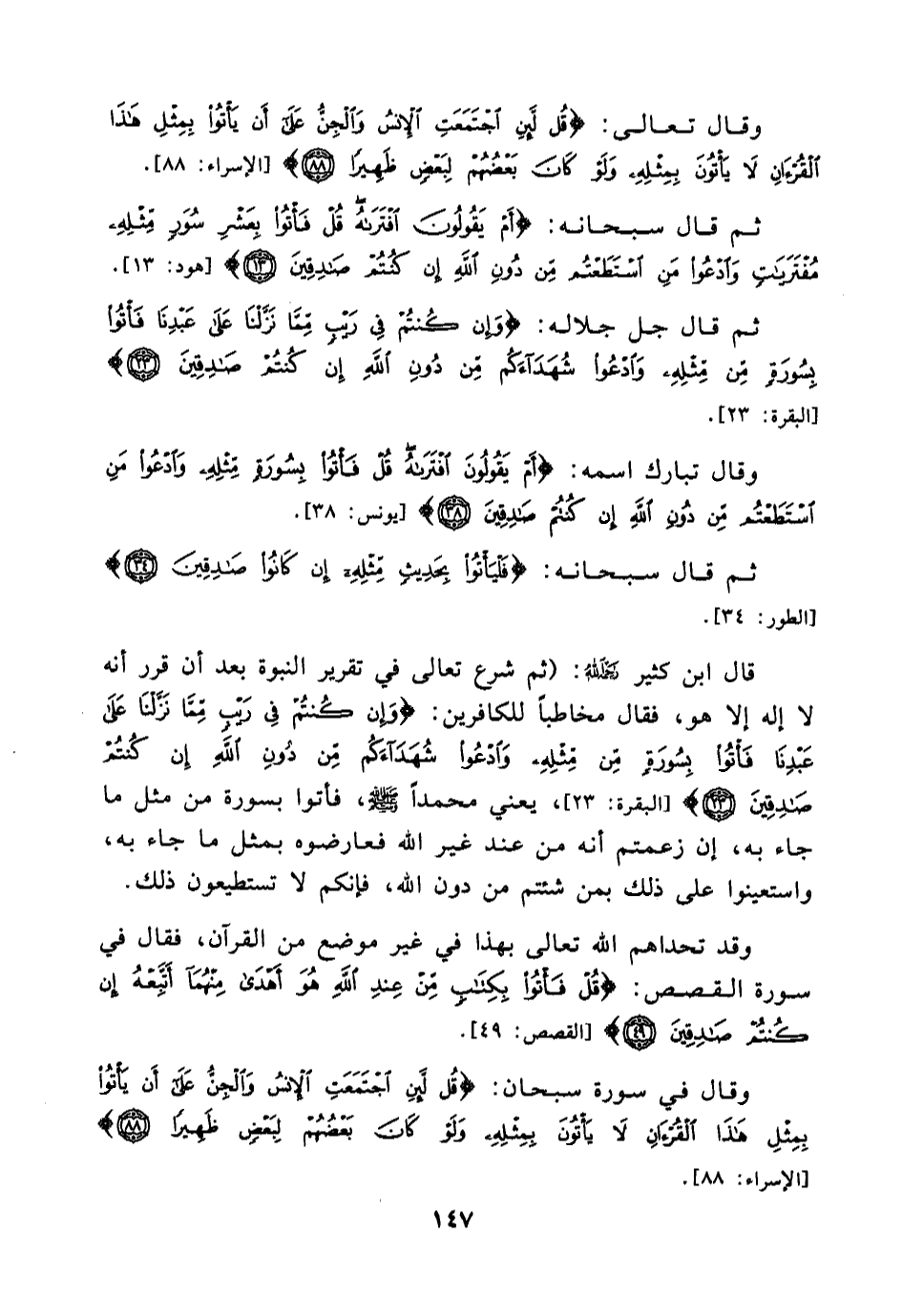 وقال تعالى: {قُل لَئِنِ اجْتَمَعَتِ الْإِنسُ وَالْجِنُّ عَلَى أَن يَأْتُوا بِمِثْلِ هَذَا الْقُرْءانِ لَا يَأْتُونَ بِمِثْلِهِ وَلَوْ كَانَ بَعْضُهُمْ لِبَعْضٍ ظَهِيرًا} [الإسراء:88] .