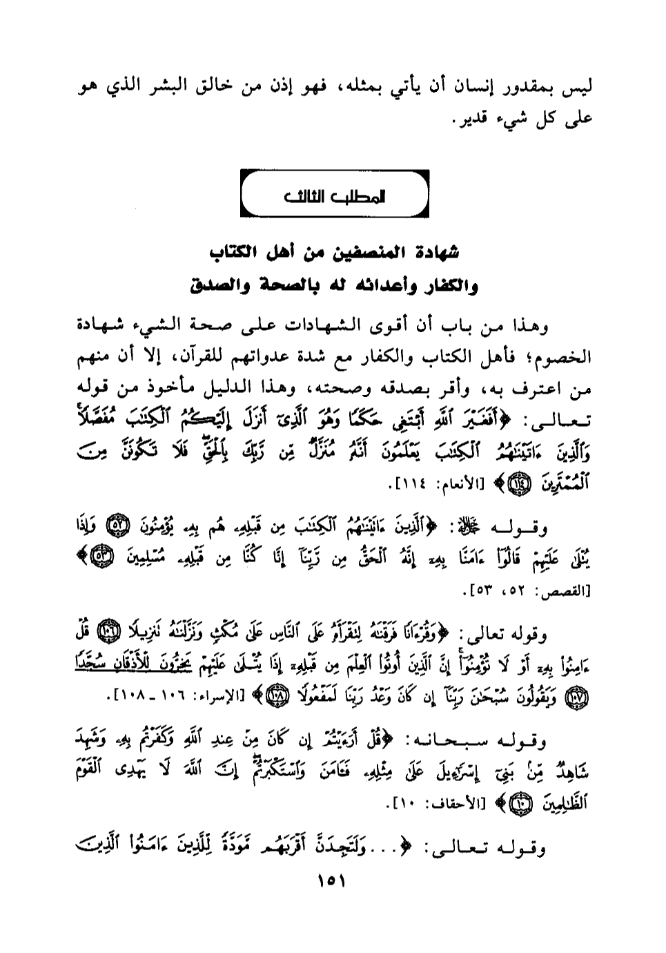 وقوله سبحانه: {قُلْ أَرَأَيْتُمْ إِنْ كَانَ مِنْ عِنْدِ اللَّهِ وَكَفَرْتُمْ بِهِ وَشَهِدَ شَاهِدٌ مِنْ بَنِي إِسْرَائِيلَ عَلَى مِثْلِهِ فَآمَنَ وَاسْتَكْبَرْتُمْ إِنَّ اللَّهَ لَا يَهْدِي الْقَوْمَ الظَّالِمِينَ} [الأحقاف:10] .