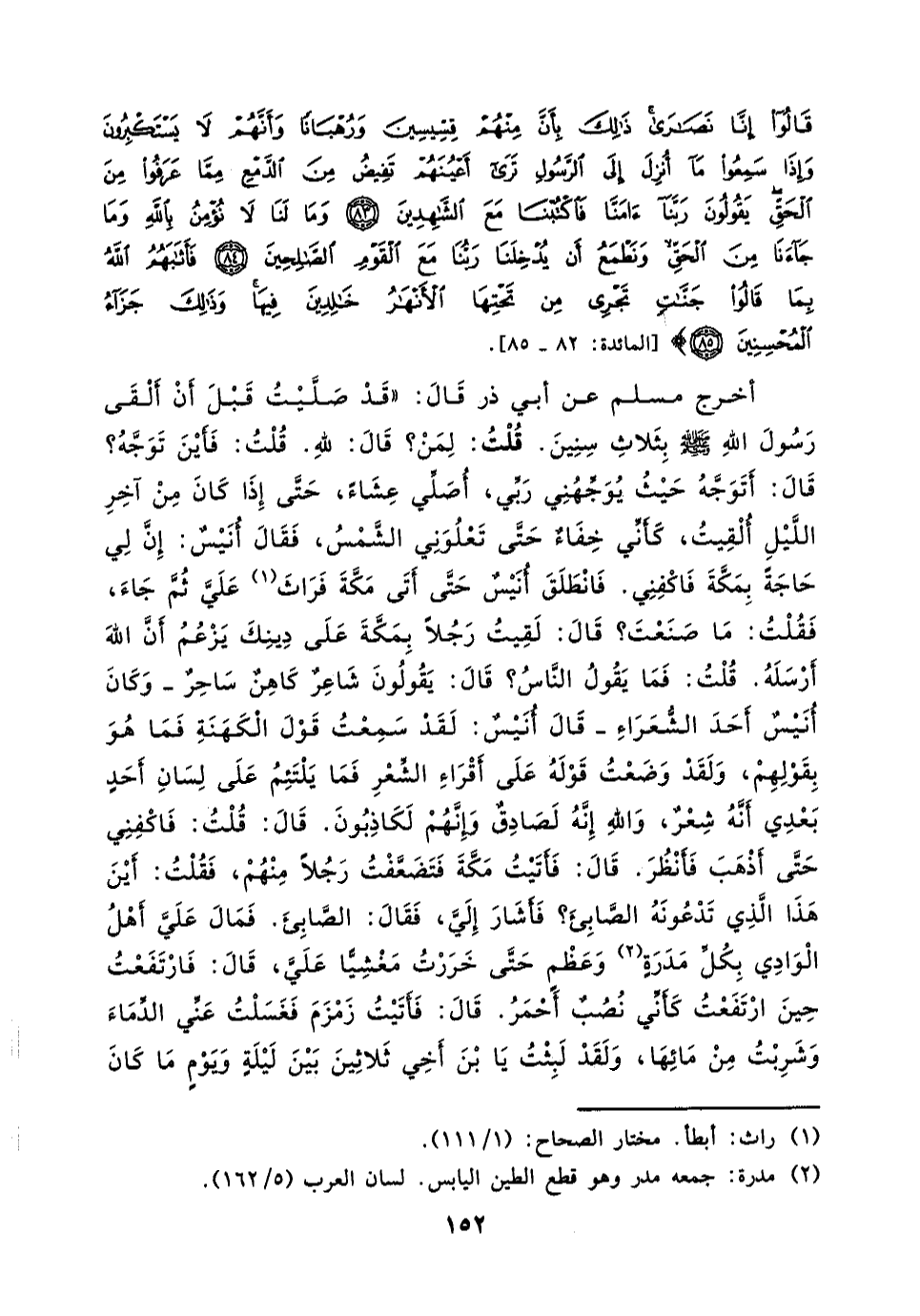 أخرج مسلم عن أبي ذر قَالَ: قَدْ صَلَّيْتُ قَبْلَ أَنْ أَلْقَى رَسُولَ اللَّهِ (صلى الله عليه وسلم) بِثَلَاثِ سِنِينَ. قُلْتُ: لِمَنْ؟ قَالَ: لِلَّهِ. قُلْتُ: فَأَيْنَ تَوَجَّهُ؟ قَالَ: أَتَوَجَّهُ حَيْثُ يُوَجِّهُنِي رَبِّي، أُصَلِّي عِشَاءً حَتَّى إِذَا كَانَ مِنْ آخِرِ اللَّيْلِ أُلْقِيتُ، كَأَنِّي خِفَاءٌ حَتَّى تَعْلُوَنِي الشَّمْسُ، فَقَالَ أُنَيْسٌ: إِنَّ لِي حَاجَةً بِمَكَّةَ فَاكْفِنِي. فَانْطَلَقَ أُنَيْسٌ حَتَّى أَتَى مَكَّةَ فَرَاثَ (¬1) عَلَيَّ ثُمَّ جَاءَ، فَقُلْتُ: مَا صَنَعْتَ؟ قَالَ: لَقِيتُ رَجُلًا بِمَكَّةَ عَلَى دِينِكَ يَزْعُمُ أَنَّ اللَّهَ أَرْسَلَهُ. قُلْتُ: فَمَا يَقُولُ النَّاسُ؟ قَالَ: يَقُولُونَ شَاعِرٌ كَاهِنٌ سَاحِرٌ -وَكَانَ أُنَيْسٌ أَحَدَ الشُّعَرَاءِ -قَالَ أُنَيْسٌ: لَقَدْ سَمِعْتُ قَوْلَ الْكَهَنَةِ فَمَا هُوَ بِقَوْلِهِمْ، وَلَقَدْ وَضَعْتُ قَوْلَهُ عَلَى أَقْرَاءِ الشِّعْرِ فَمَا يَلْتَئِمُ عَلَى لِسَانِ أَحَدٍ بَعْدِي أَنَّهُ شِعْرٌ، وَاللَّهِ إِنَّهُ لَصَادِقٌ وَإِنَّهُمْ لَكَاذِبُونَ. قَالَ قُلْتُ: فَاكْفِنِي حَتَّى أَذْهَبَ فَأَنْظُرَ. قَالَ: فَأَتَيْتُ مَكَّةَ فَتَضَعَّفْتُ رَجُلًا مِنْهُمْ، فَقُلْتُ: أَيْنَ هَذَا الَّذِي تَدْعُونَهُ الصَّابِئَ؟ فَأَشَارَ إِلَيَّ، فَقَالَ: الصَّابِئَ. فَمَالَ عَلَيَّ أَهْلُ الْوَادِي بِكُلٍّ مَدَرَةٍ (¬2) وَعَظْمٍ حَتَّى خَرَرْتُ مَغْشِيًّا عَلَيَّ، قَالَ: فَارْتَفَعْتُ حِينَ ارْتَفَعْتُ كَأَنِّي نُصُبٌ أَحْمَرُ. قَالَ: فَأَتَيْتُ زَمْزَمَ فَغَسَلْتُ عَنِّي الدِّمَاءَ وَشَرِبْتُ مِنْ مَائِهَا، وَلَقَدْ لَبِثْتُ يَا ابْنَ أَخِي ثَلَاثِينَ بَيْنَ لَيْلَةٍ وَيَوْمٍ مَا كَانَ