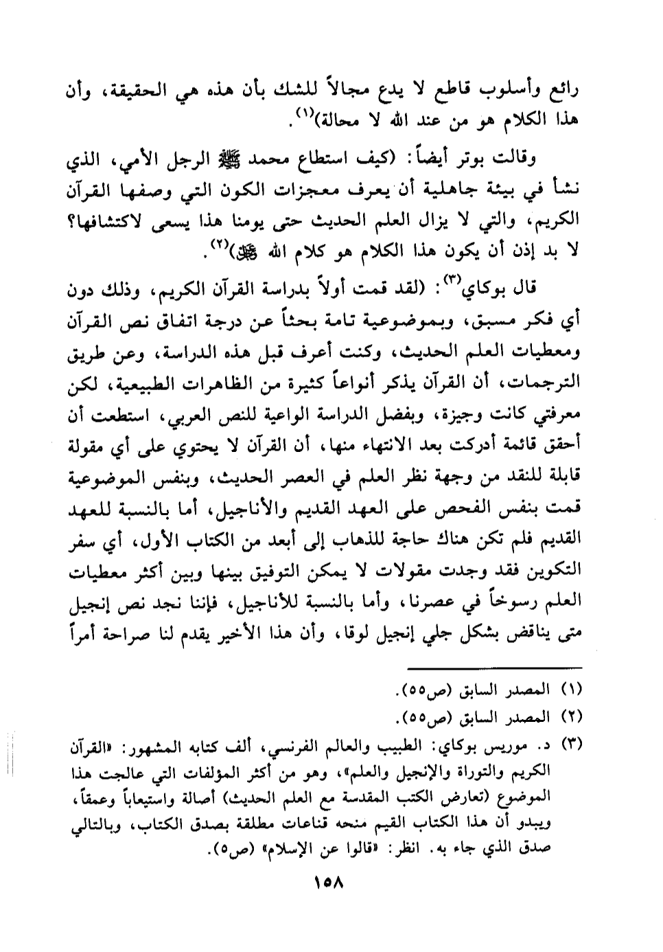 (¬3) د. موريس بوكاي: الطبيب والعالم الفرنسي، ألف كتابه المشهور " القرآن الكريم والتوراة والإنجيل والعلم" وهو من أكثر المؤلفات التي عالجت هذا الموضوع (تعارض الكتب المقدسة مع العلم الحديث) أصالة واستيعاباً وعمقاً، ويبدوا أن هذا الكتاب القيم منحه قناعات مطلقة بصدق الكتاب، وبالتالي صدق الذي جاءته. (انظر:"قالوا عن الإسلام ": ص 56)