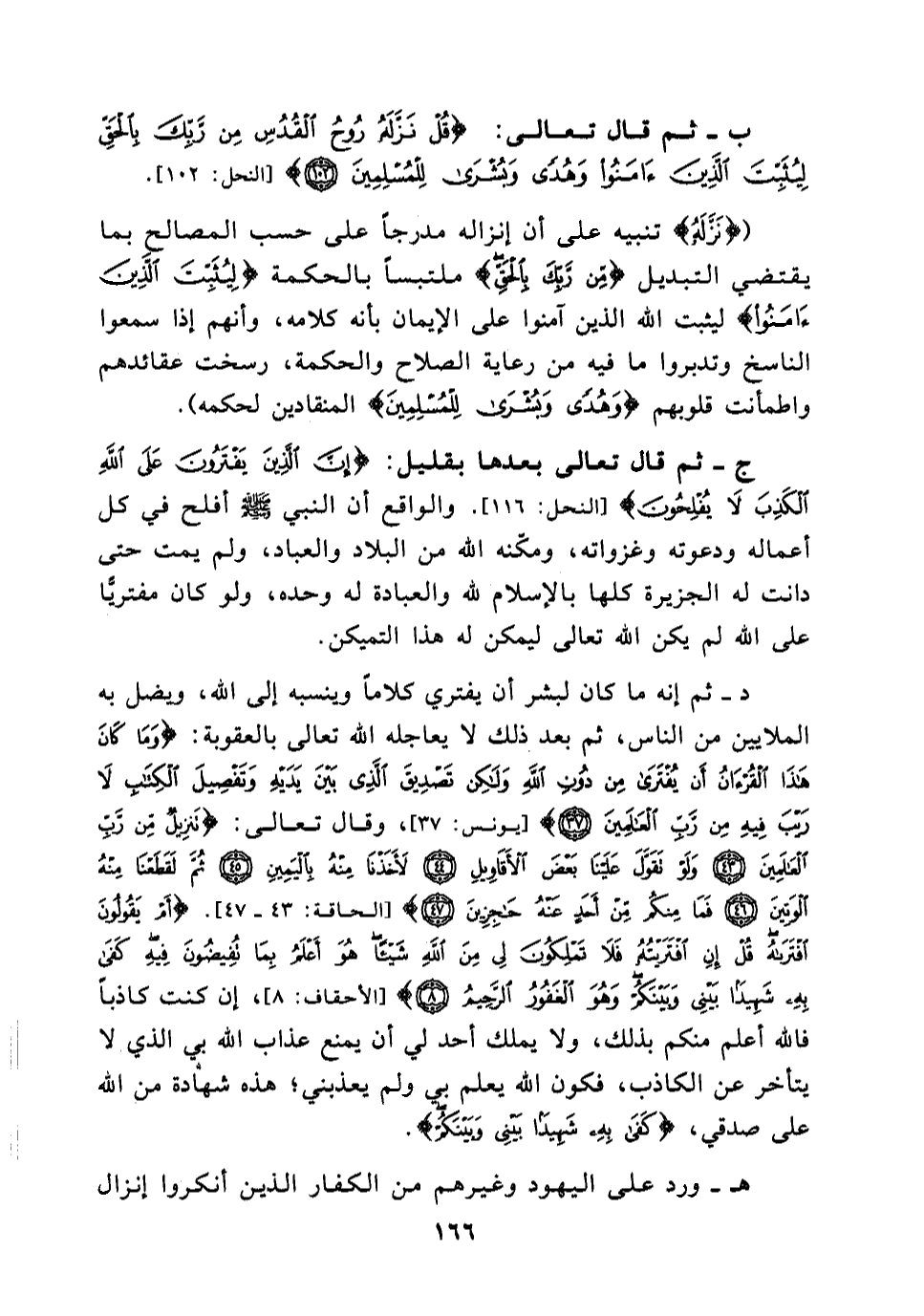 ب-ثم قال تعالى: {قل نزله روح القدس من ربك بالحق ليثبت الذين آمنوا وهدى وبشرى للمسلمين} [النحل:102] ("ونزله" تنبيه على أن إنزاله مدرجا على حسب المصالح بما يقتضي التبديل (من ربك بالحق (ملتبسا بالحكمة (ليثبت الذين آمنوا (ليثبت الله الذين آمنوا على الإيمان بأنه كلامه، وأنهم إذا سمعوا الناسخ وتدبروا ما فيه من رعاية الصلاح والحكمة، رسخت عقائدهم واطمأنت قلوبهم (وهدى وبشرى للمسلمين (المنقادين لحكمه) .