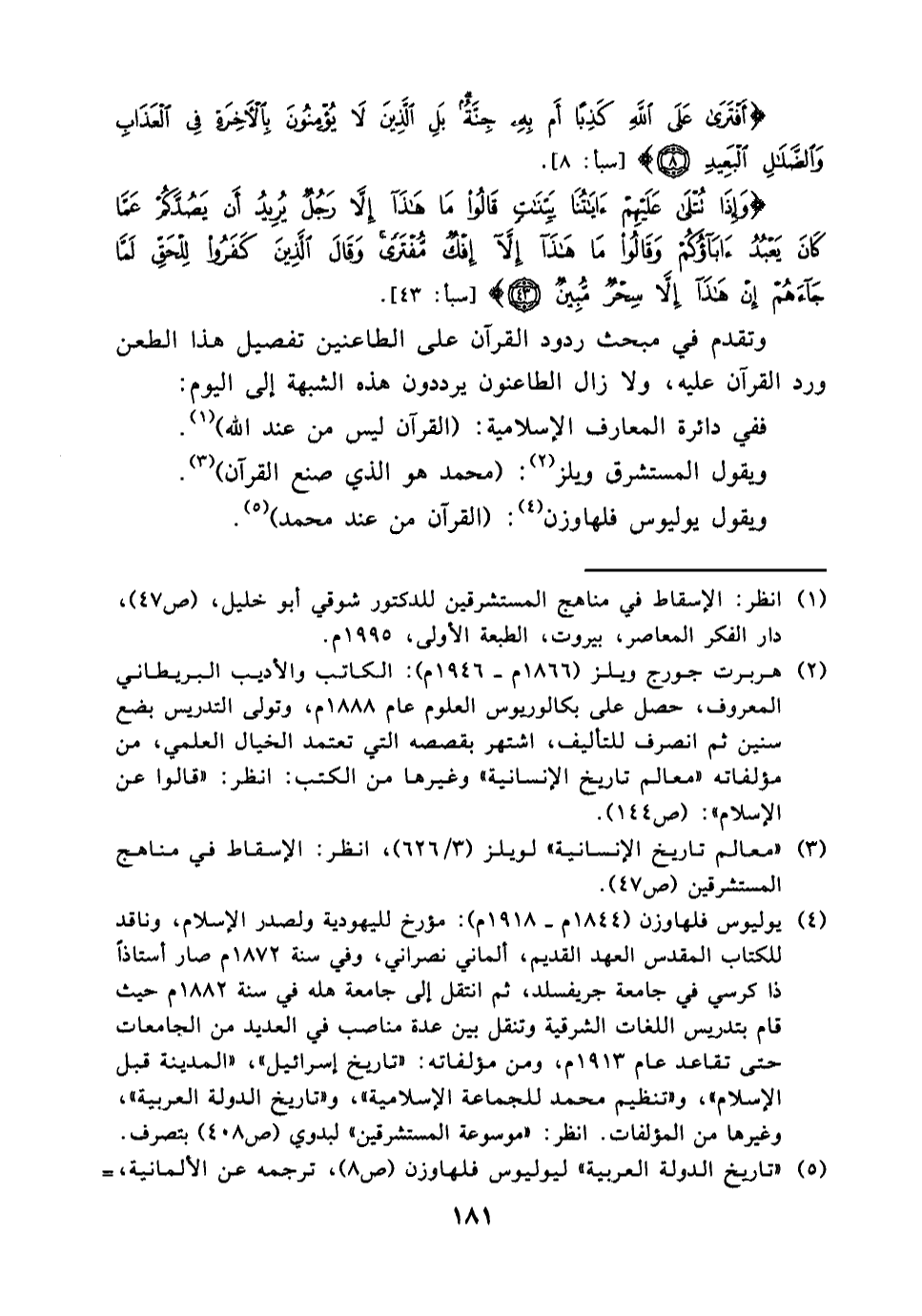 (¬4) يوليوس فلهاوزن [1844 - 1918] : مؤرخ لليهودية ولصدر الإسلام، وناقد للكتاب المقدس (العهد القديم) ، ألماني نصراني، وفي سنة 1872 صار أستاذا ذاكر سي فى جامعة جريفسلد، ثم أنتقل إلى جامعة هله halle فى سنة 1882 حيث قام بتدريس اللغات الشرقية وتنقل بين عدة مناصب فى العديد من الجامعات حتى تقاعد عام 1913، ومن مؤلفاته: " تاريخ اسرائيل، " المدينة قبل الإسلام " و " تنظيم محمد للجماعة الإسلامية "، وتاريخ الدولة العربية "، وغيرها من المؤلفات. انظر: (موسوعة المستشرقين، لبدوي (ص: 408) بتصرف.