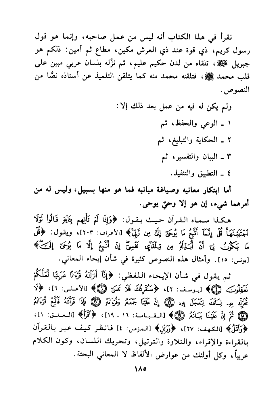 نقرأ في هذا الكتاب أنه ليس من عمل صاحبه، وإنما هو قول رسول كريم، ذي قوة عند ذي العرش مكين، مطاع ثَمَّ أمين: ذلكم هو جبريل عليه السلام، تلقاه من لدن حكيم عليم، ثم نزله بلسان عربي مبين على قلب محمد (صلى الله عليه وسلم) ، فتلقنه محمد منه كما يتلقن التلميذ عن أستاذه نصاً من النصوص، ولم يكن له فيه من عمل بعد ذلك إلا: