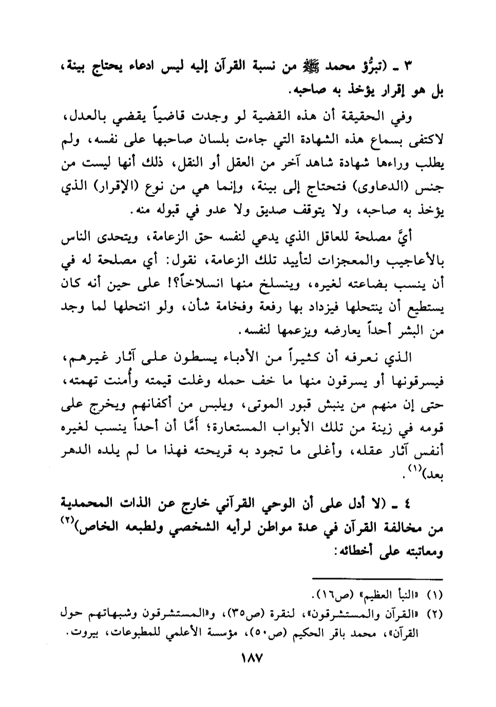 3- (تبرؤ محمد (من نسبة القرآن إليه ليس ادعاء يحتاج بينة، بل هو إقرار يؤخذ به صاحبه؛