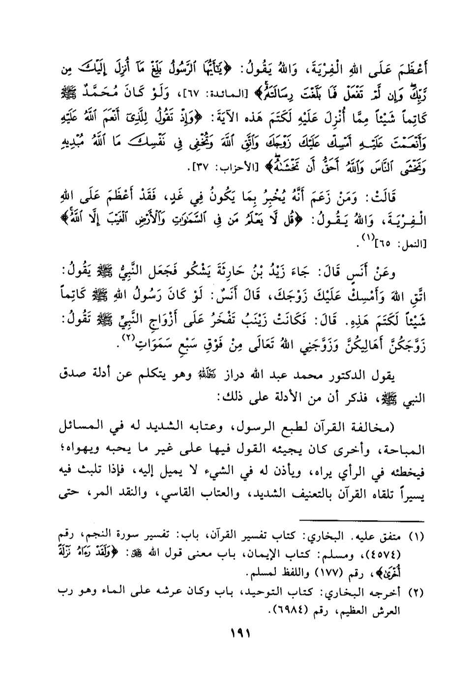 يقول الدكتور محمد عبد الله دراز -رحمه الله- وهو يتكلم عن أدلة صدق النبي (صلى الله عليه وسلم) ، فذكر أن من الأدلة على ذلك: