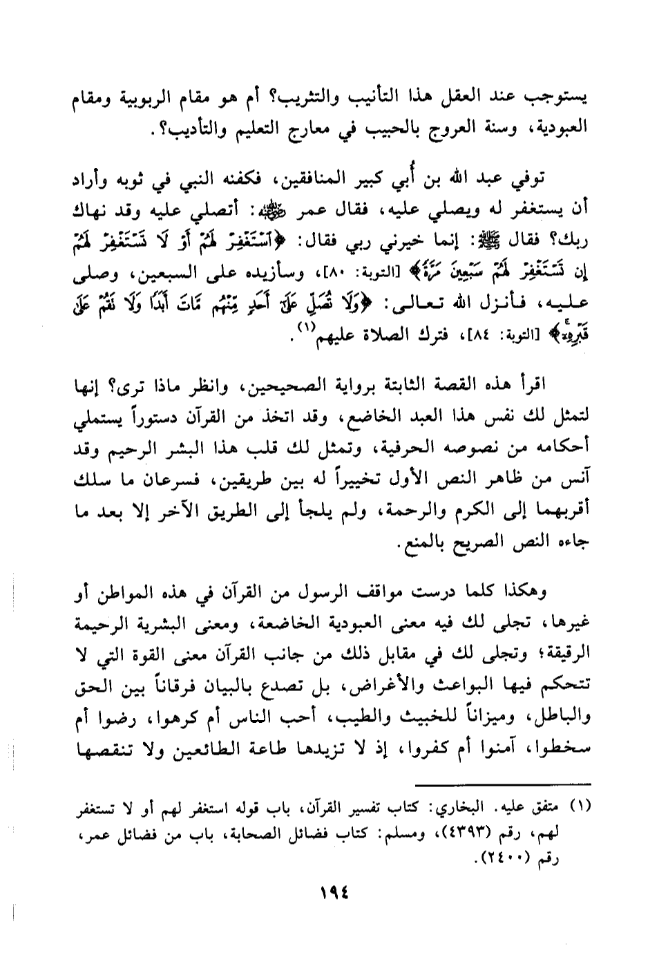 توفي عبد الله بن أُبي كبير المنافقين، فكفنه النبي في ثوبه وأراد أن يستغفر له ويصلي عليه، فقال عمر رضي الله عنه: أتصلي عليه وقد نهاك ربك؟ فقال (: إنما خيرني ربي فقال {استغفر لهم أو لا تستغفر لهم إن تستغفر لهم سبعين مرة} [التوبة: 80] وسأزيده على السبعين، وصلى عليه، فأنزل الله تعالى: {ولا تصل على أحدٍ منهم مات أبداً ولا تقم على قبره} [التوبة:84] فترك الصلاة عليهم) (¬1) ؛ اقرأ هذه القصة الثابتة برواية الصحيحين , وانظر ماذا ترى؟ إنها لتمثل لك نفس هذا العبد الخاضع , وقد اتخذ من القرآن دستوراً يستملي أحكامه من نصوصه الحرفية، وتمثل لك قلب هذا البشر الرحيم وقد آنس من ظاهر النص الأول تخييراً له بين طريقين , فسرعان ما سلك أقربهما إلى الكرم والرحمة , ولم يلجأ إلى الطريق الآخر إلا بعد ما جاءه النص الصريح بالمنع. وهكذا كلما درست مواقف الرسول من القرآن في هذه المواطن أو غيرها , تجلى لك فيه معنى العبودية الخاضعة , ومعنى البشرية الرحيمة الرقيقة؛ وتجلى لك في مقابل ذلك من جانب القرآن معنى القوة التي لا تتحكم فيها البواعث والأغراض , بل تصدع بالبيان فرقاناً بين الحق والباطل، وميزاناً للخبيث والطيب، أحب الناس أم كرهوا، رضوا أم سخطوا، آمنوا أم كفروا، إذ لا تزيدها طاعة الطائعين ولا تنقصها