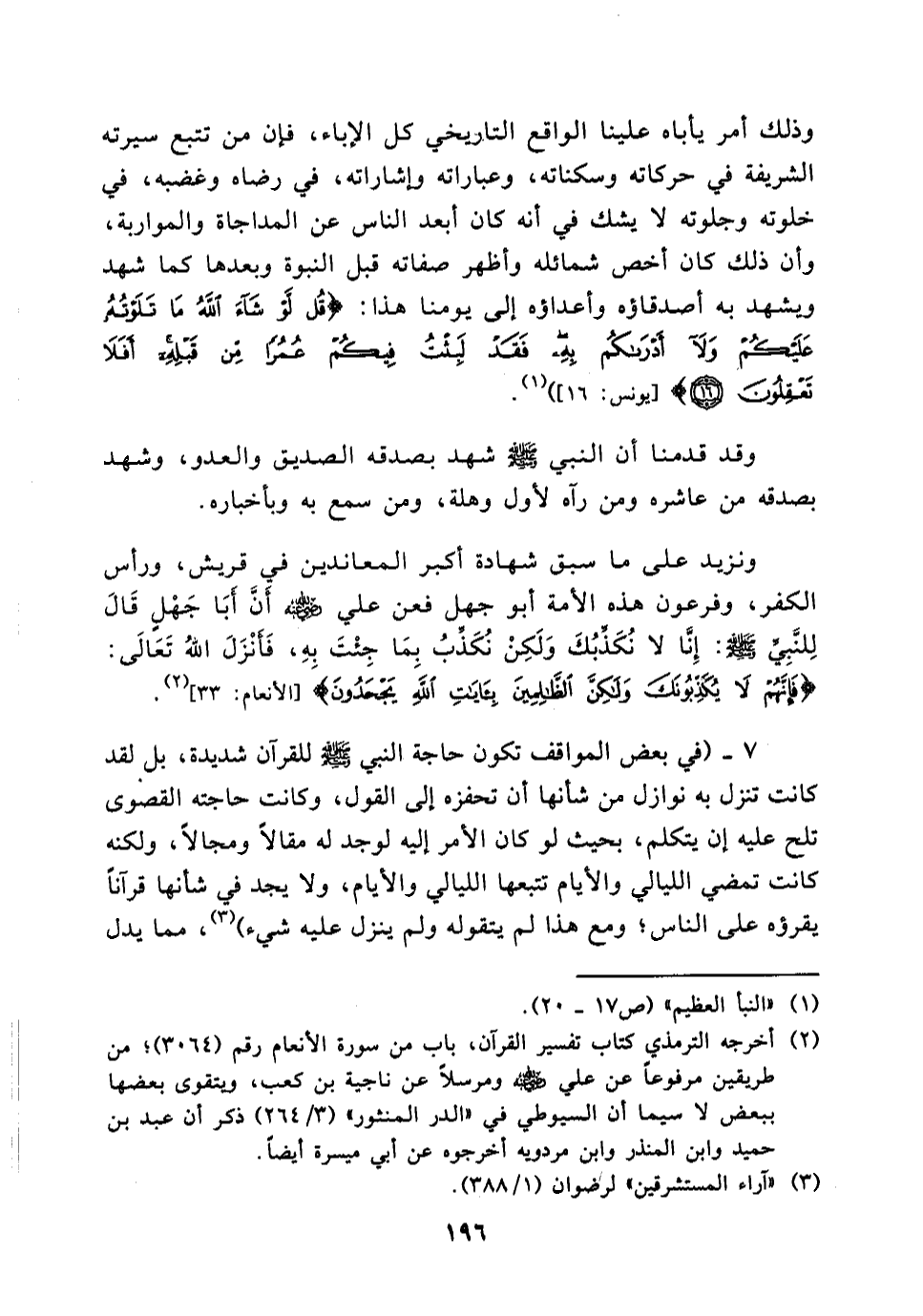 7- (في بعض المواقف تكون حاجة النبي (صلى الله عليه وسلم) للقرآن شديدة، بل لقد كانت تنزل به نوازل من شأنها أن تحفزه إلى القول، وكانت حاجته القصوى تلح عليه أن يتكلم، بحيث لو كان الأمر إليه لوجد له مقالاً ومجالاً، ولكنه كانت تمضي الليالي والأيام تتبعها الليالي والأيام, ولا يجد في شأنها قرآناً يقرؤه على الناس؛ ومع هذا لم يتقوله ولم ينزل عليه شيء) (¬3) ، مما يدلك