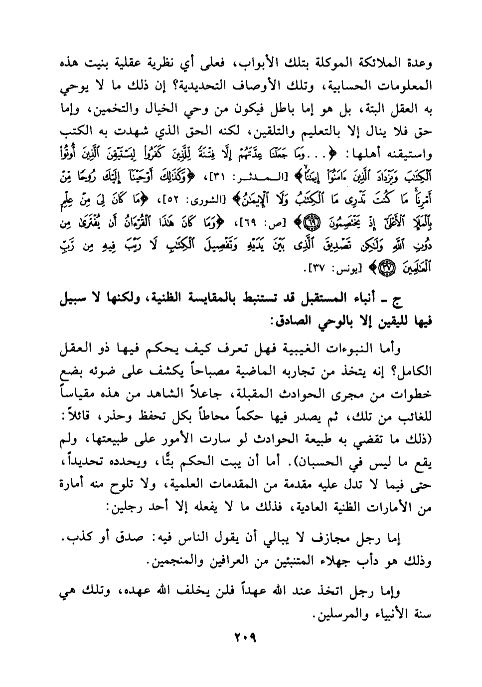 وأما النبوءات الغيبية فهل تعرف كيف يحكم فيها ذو العقل الكامل؟ إنه يتخذ من تجاربه الماضية مصباحاً يكشف على ضوئه بضع خطوات من مجرى الحوادث المقبلة، جاعلاً الشاهد من هذه مقياساً للغائب من تلك، ثم يصدر فيها حكماً محاطاً بكل تحفظ وحذر، قائلاً: (ذلك ما تقضي به طبيعة الحوادث لو سارت الأمور على طبيعتها , ولم يقع ما ليس في الحسبان) . أما أن يبت الحكم بتاً , ويحدده تحديدا ,ً حتى فيما لا تدل عليه مقدمة من المقدمات العلمية، ولا تلوح منه أمارة من الأمارات الظنية العادية، فذلك ما لا يفعله إلا أحد رجلين: