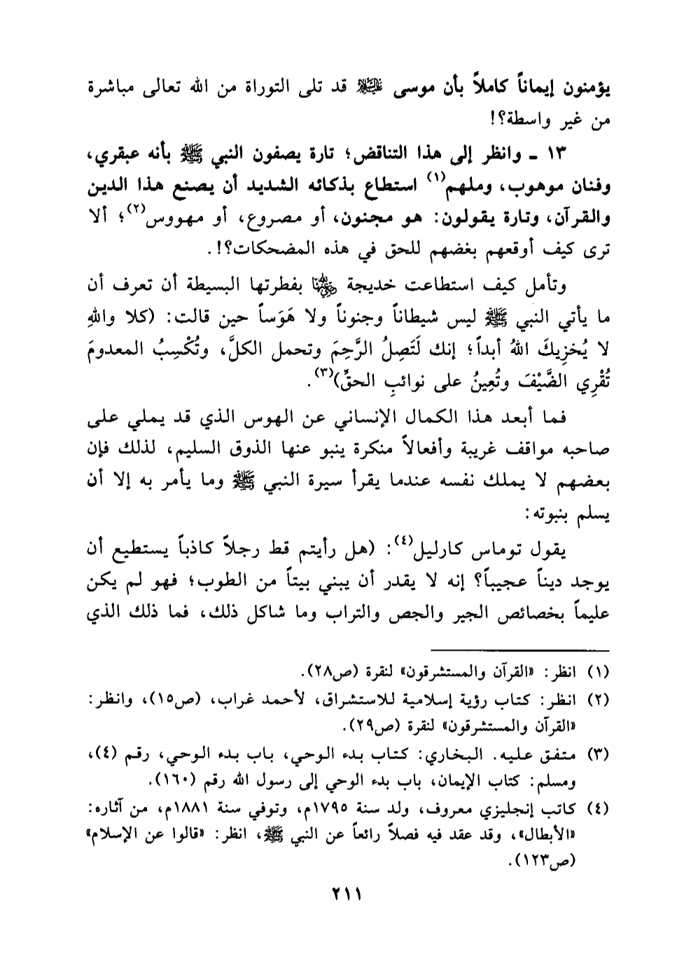 13-وانظر إلى هذا التناقض؛ تارة يصفون النبي (صلى الله عليه وسلم) بأنه عبقري , وفنان موهوب, وملهم (¬1) استطاع بذكائه الشديد أن يصنع هذا الدين والقرآن، وتارة يقولون هو, مجنون , أو مصروع ,أو مهووس (¬2) ؛ ألا ترى كيف أوقعهم بغضهم للحق في هذه المضحكات؟