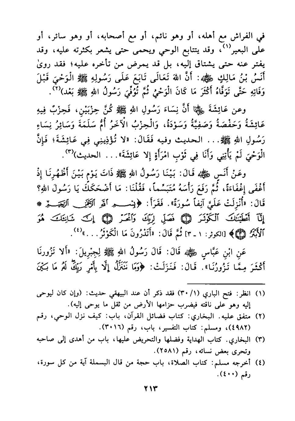 وعَنْ أَنَسٍ قَالَ: بَيْنَا رَسُولُ اللَّهِ (صلى الله عليه وسلم) ذَاتَ يَوْمٍ بَيْنَ أَظْهُرِنَا إِذْ أَغْفَى إِغْفَاءَةً , ثُمَّ رَفَعَ رَأْسَهُ مُتَبَسِّمًا , فَقُلْنَا: مَا أَضْحَكَكَ يَا رَسُولَ اللَّهِ؟ قَالَ: «أُنْزِلَتْ عَلَيَّ آنِفًا سُورَةٌ» . فَقَرَأَ بِسْمِ اللَّهِ الرَّحْمَنِ الرَّحِيمِ (إِنَّا أَعْطَيْنَاكَ الْكَوْثَرَ فَصَلِّ لِرَبِّكَ وَانْحَرْ إِنَّ شَانِئَكَ هُوَ الْأَبْتَرُ (ثُمَّ قَالَ: «أَتَدْرُونَ مَا الْكَوْثَرُ ... » (¬4) .