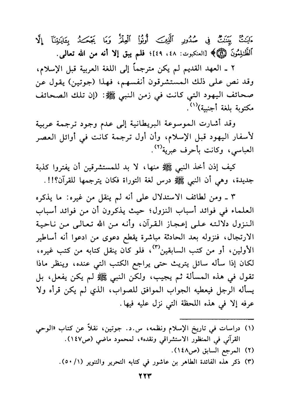 2-العهد القديم لم يكن مترجما إلى اللغة العربية قبل الإسلام، وقد نص على ذلك المستشرقون أنفسهم، فهذا (جوتين) يقول عن صحائف اليهود: (إن تلك الصحائف مكتوبة بلغة أجنبية) (¬1) ، وقد أشارت الموسوعة البريطانية إلى عدم وجود ترجمة عربية لأسفار اليهود قبل الإسلام وأن أول ترجمة كانت في أوائل العصر العباسي , وكانت بأحرف عبرية (¬2) .