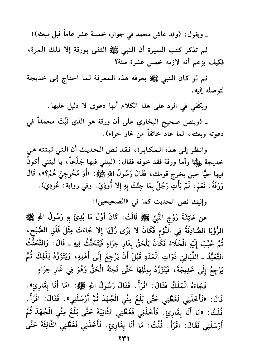 - (وينص صحيح البخاري على أن ورقة هو الذي ثَََبَّتَ محمدا في دعوته وبعثته ,لما عاد خائفا من غار حراء) . وانظر إلى هذه المكابرة، فقد نص الحديث أن التي ثبتته هي خديجة - رضي الله عنها- وأما ورقة فقد خوفه فقال: (ليتني فيها، جَذِعاً يا ليتني أكونُ فيها حياً حين يخرج قومك، فقَالَ رَسُولُ اللَّهِ (صلى الله عليه وسلم) : «أَوَمُخْرِجِيَّ هُمْ» ؟ قَالَ وَرَقَةُ: نَعَمْ, لَمْ يَأْتِ رَجُلٌ بِمَا جِئْتَ بِهِ إِلَّا أُوذِيَ. في رواية: عُودِيَ) . وإليك نص الحديث كما في الصحيحين؛