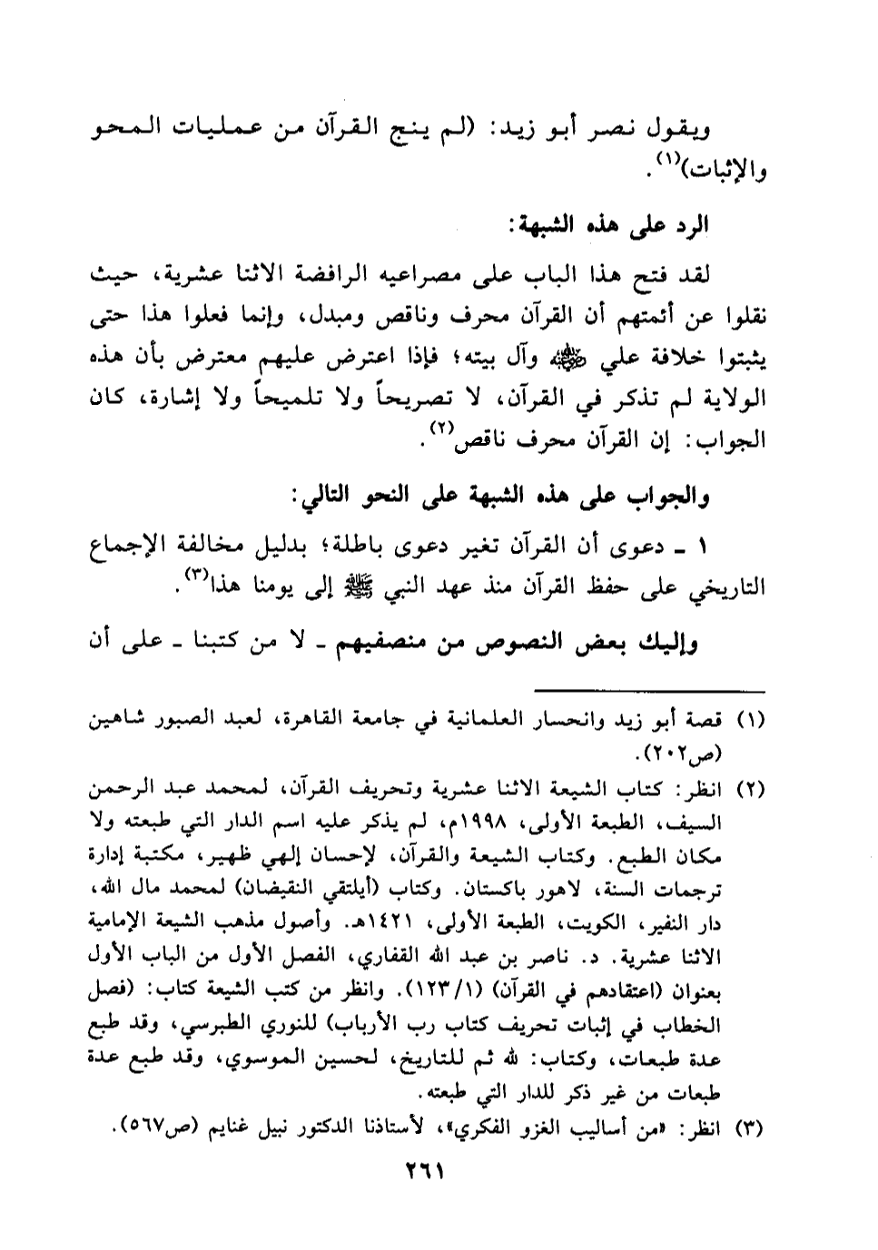 1- دعوى أن القرآن تبدل كله لها اتصال وثيق بالشبهة التي تليها , ولكنها زادت في المبالغة والسذاجة حتى ادعت بأن القرآن كله قد تغير، مخالفين بذلك الإجماع التاريخي على حفظ القرآن منذ عهد النبي (صلى الله عليه وسلم) إلى يومنا هذا (¬2) ، وإليك بعض النصوص من منصفيهم -لا من كتبنا- على أن