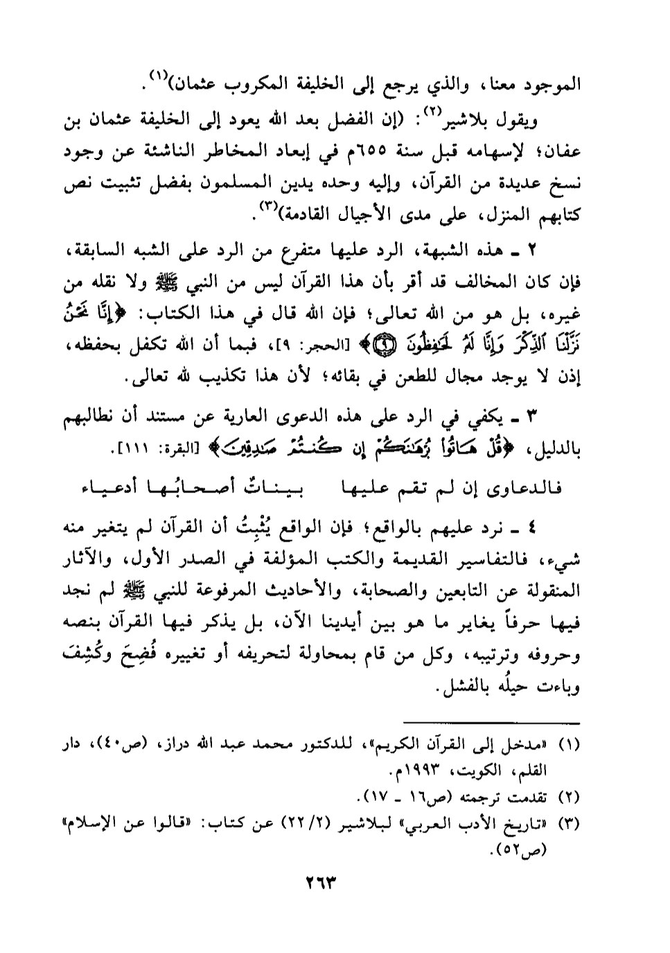 ويقول بلاشير (¬2) : (إن الفضل بعد الله يعود إلى الخليفة عثمان بن عفان؛ لإسهامه قبل سنة 655م في إبعاد المخاطر الناشئة عن وجود نسخ عديدة من القرآن، وإليه وحده يدين المسلمون بفضل تثبيت نص كتابهم المنزل، على مدى الأجيال القادمة) (¬3) .