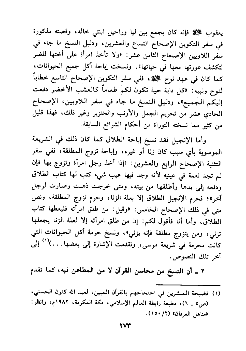 وأما الإنجيل فقد نسخ إباحة الطلاق كما كان ذلك في الشريعة الموسوية بأي سبب كان زنا أو غيره، وإباحة تزوج المطلقة، ففي سفر التثنية الإصحاح الرابع والعشرين "إذا أخذ رجل امرأة وتزوج بها فإن لم تجد نعمة في عينيه لأنه وجد فيها عيب شيء كتب لها كتاب الطلاق ودفعه إلى يدها وأطلقها من بيته، ومتى خرجت ذهبت وصارت لرجل آخر"؛فحرم الإنجيل الطلاق إلا بعلة الزنا، وحرم تزوج المطلقة، ونص متى في ذلك الإصحاح الخامس "وقيل من طلق امرأته فليعطها كتاب الطلاق، وأما أنا فأقول لكم إن من طلق امرأته إلا لعلة الزنا يجعلها تزني، ومن يتزوج مطلقة فإنه يزني "، ونسخ حرمة أكل الحيوانات التي كانت محرمة في شريعة موسى، وتقدمت الإشارة إلى بعضها ... ) (¬1) إلى أخر تلك النصوص.