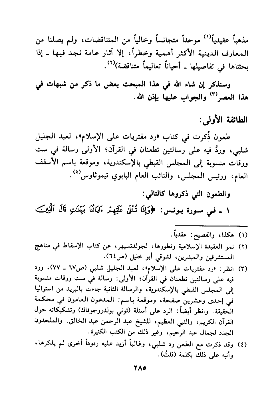 (¬3) انظر: "رد مفتريات على الإسلام "، لعبد الجليل شلبي (ص:67-77) ، ورد فيه على رسالتين تطعنان في القرآن؛ الأولى رسالة في ست ورقات منسوبة إلى المجلس القبطي بالإسكندرية، والرسالة الثانية جاءت بالبريد من استراليا في إحدى وعشرين صفحة، وموقعه باسم: المدعون العامون في محكمة الحقيقة.
