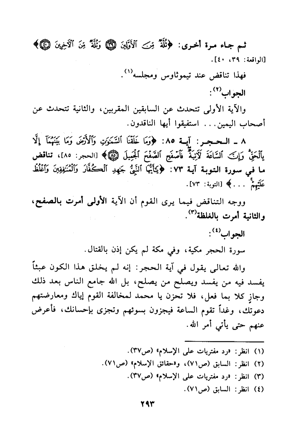ووجه التناقض فيما يرى القوم أن الآية الأولى أمرت بالصفح ,والثانية أمرت بالغلظة (¬3) .
