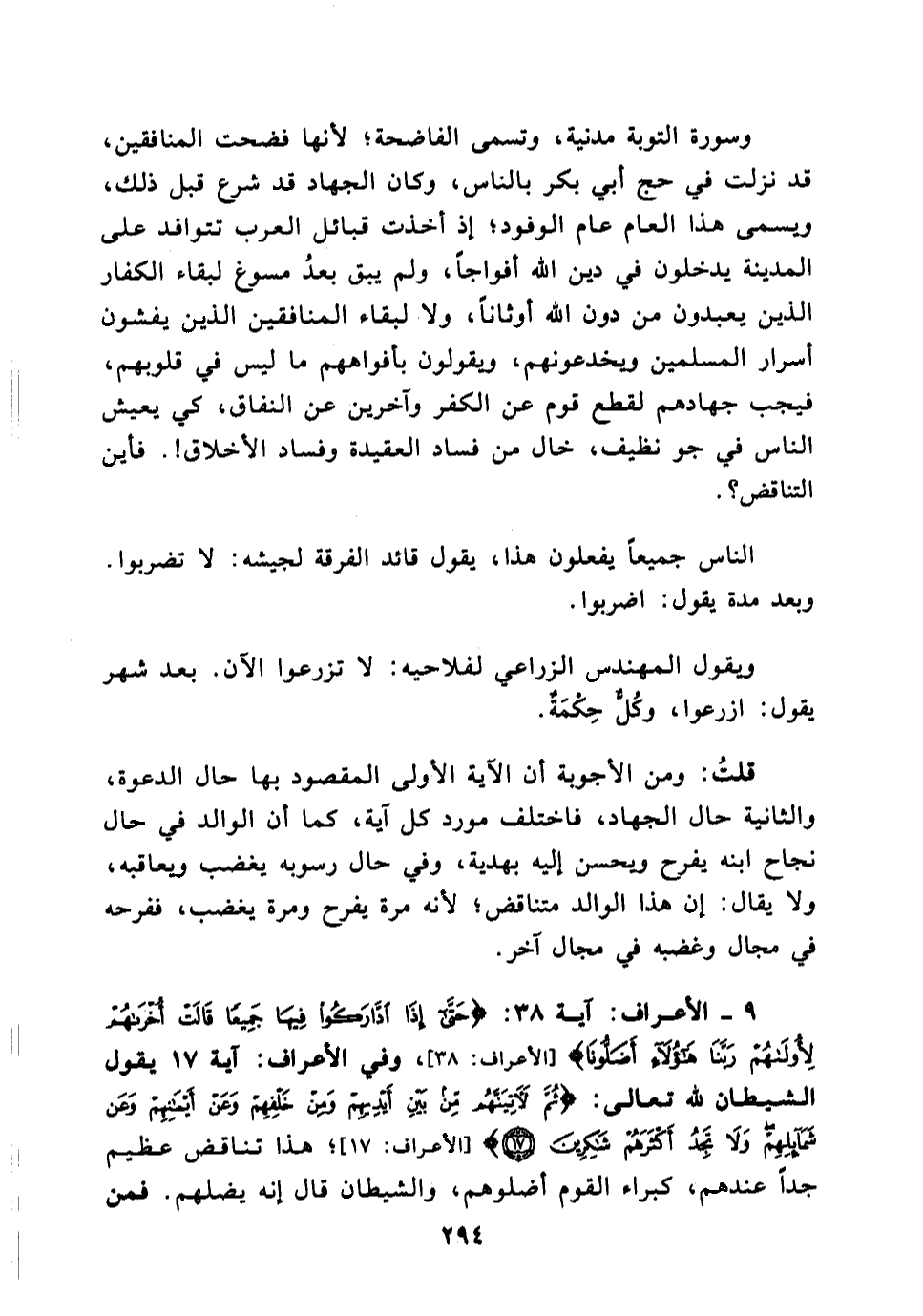 9- الأعراف أية 37: (حتى إذا أدركوا فيها جميعا قالت أخراهم لأولاهم ربنا هؤلاء أضلونا (، وفي الأعراف آية 17 يقول الشيطان لله تعالى: (ثم لآتينهم من بين أيديهم ومن خلفهم وعن أيمانهم وعن شمائلهم ولا تجد أكثرهم شاكرين (؛ هذا تناقض عظيم جدا عندهم، كبراء القوم أضلوهم، والشيطان قال إنه يضلهم. فمن