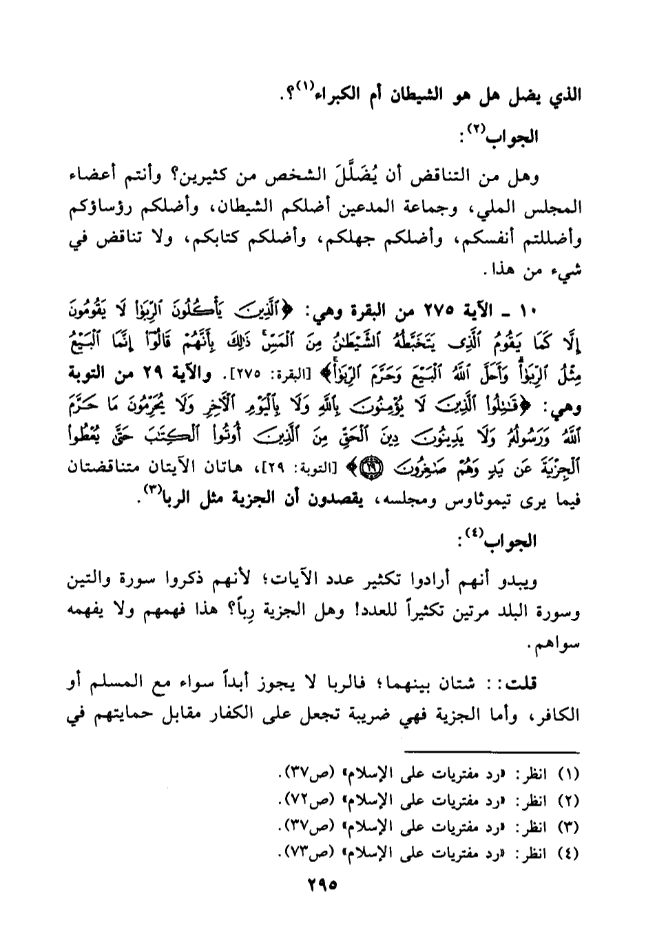 10-الآية 275من البقرة وهي: (الذين يأكلون الربا لا يقومون إلا كما يقوم الذي يتخبطه الشيطان من المس ذلك بأنهم قالوا إنما البيع مثل الربا وأحل البيع وحرم الربا (. والآية 29 من التوبة وهي: (قاتلوا الذين لا يؤمنون بالله ولا باليوم الآخر ولا يحرمون ما حرم الله ورسوله ولا يدينون دين الحق من الذين أوتوا الكتاب حتى يعطوا الجزية عن يد وهم صاغرون (، هاتان الآيتان متناقضتان فيما يرى تيموثاوس ومجلسه، يقصدون أن الجزية مثل الربا (¬3) .