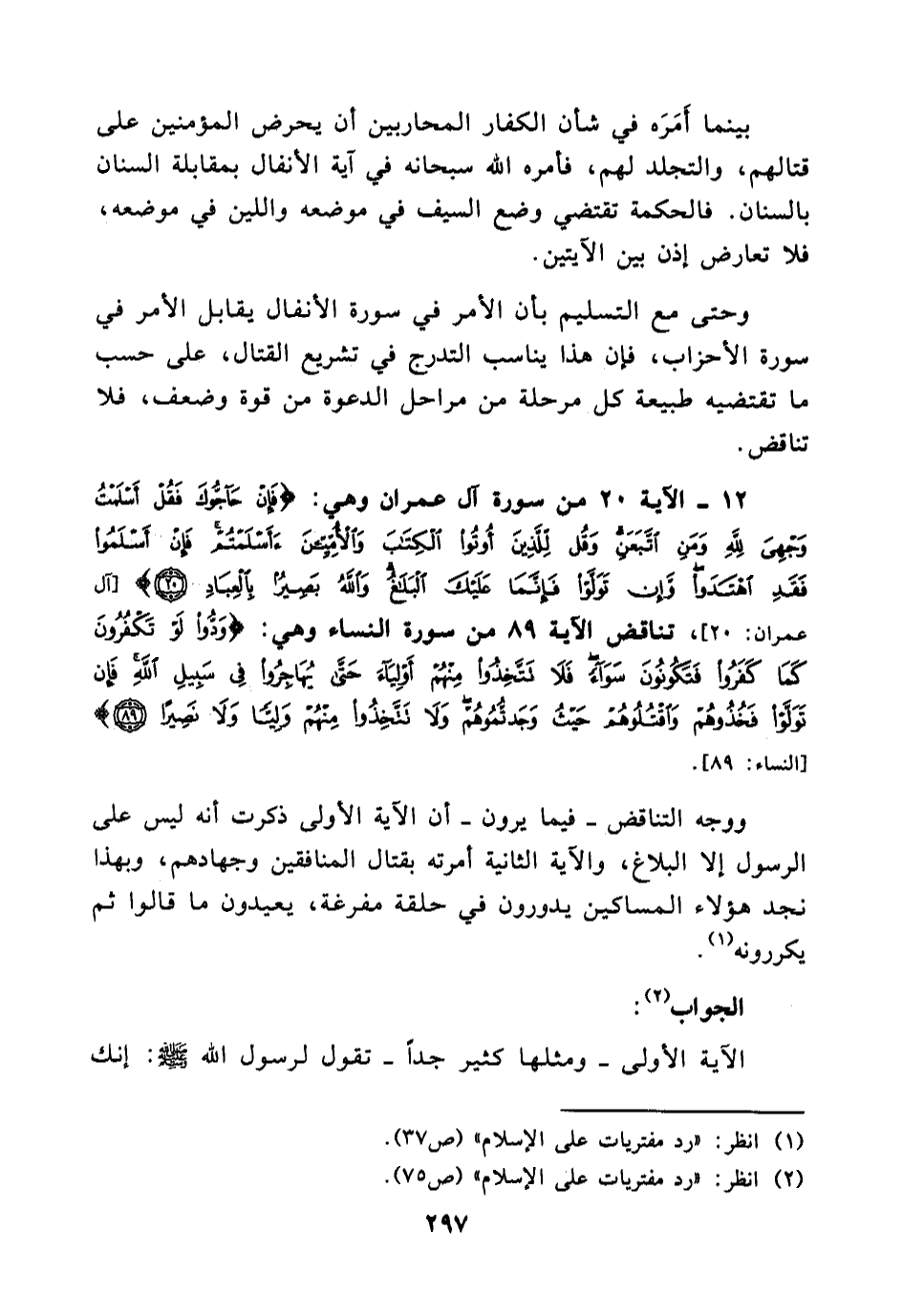 12- الآية 20 من سورة آل عمران وهي: (فإن حاجوك فقل أسلمت وجهي لله ومن اتبعن، وقل للذين أوتوا الكتاب والأميين أأسلمتم، فإن أسلموا فقد اهتدوا وإن تولوا فإنما عليك البلاغ والله بصير بالعباد (، تناقض الآية 89 من سورة النساء وهي: (ودوا لو تكفرون كما كفروا فتكونون سواء فلا تتخذوا منهم أولياء حتى يهاجروا في سبيل الله فإن تولوا فخذوهم واقتلوهم حيث وجدتموهم، ولا تتخذوا منهم وليا ولا نصيرا (.