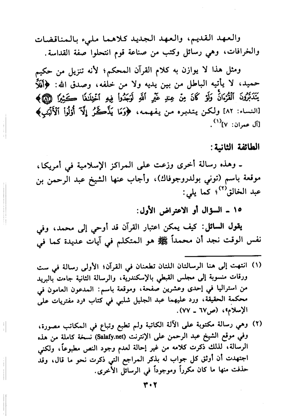 (¬2) وهي رسالة مكتوبة على الآلة الكاتبة ولم تطبع وتباع في المكاتب مصورة، وفي موقع الشيخ عبد الرحمن على الإنترنت (salafy.net) نسخة كاملة من هذه الرسالة، لذلك ذكرت كلامه من غير إحالة لعدم وجود النص مطبوعا، ولكني اجتهدت أن أوثق كل جواب له بذكر المراجع التي ذكر نحو ما قال.