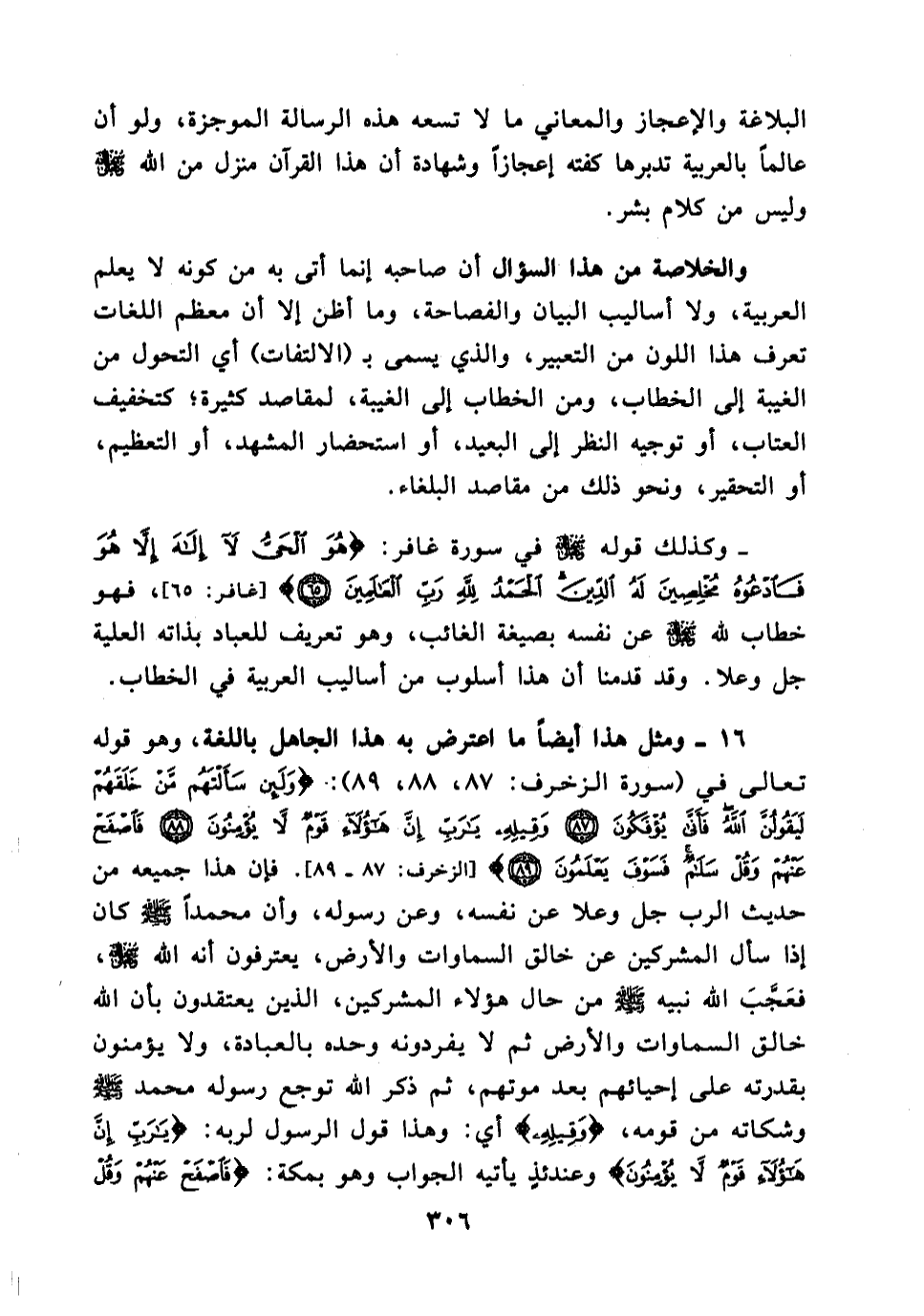 ومثل هذا أيضا ما اعترض به هذا الجاهل باللغة ,وهو قوله تعالى في (سورة الزخرف:87، 88، 89) : (ولئن سألتهم من خلقهم ليقولن الله فأنى يؤفكون وقيله يا رب إن هؤلاء قوم لا يؤمنون فاصفح عنهم وقل سلام فسوف يعلمون (. فإن هذا جميعه من حديث الرب جل وعلا عن نفسه، وعن رسوله، وأن محمدا (كان إذا سأل المشركين عن خالق السماوات والأرض ,يعترفون أنه الله سبحانه وتعالى, فعَجَّبَ الله نبيه (من حال هؤلاء المشركين, الذين يعتقدون بأن الله خالق السماوات والأرض ثم لا يفردونه وحده بالعبادة، ولا يؤمنون بقدرته على إحيائهم بعد موتهم، ثم ذكر الله توجع رسوله محمد (صلى الله عليه وسلم) وشكاته من قومه , (وقيله (أي وهذا قول الرسول لربه (يا رب إن هؤلاء قوم لا يؤمنون (وعندئذ يأتيه الجواب وهو بمكة (فاصفح عنهم وقل