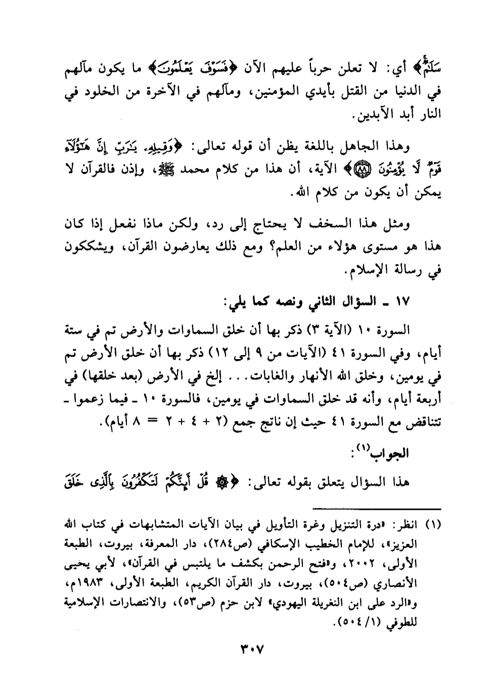 (¬1) انظر: درة التنزيل وغرة التأويل في بيان الآيات المتشابهات في كتاب الله العزيز، للإمام الخطيب الإسكافي (ص:284) ، دار المعرفة، بيروت، الطبعة الأولى 2002،وفتح الرحمن بكشف ما يلتبس في القرآن، لأبي يحيى الأنصاري (ص:504) ،بيروت، دار القرآن الكريم، الطبعة الأولى 1983،والرد على ابن النغريلة اليهودي لابن حزم (ص:53) ، والانتصارات الإسلامية للطوفي (1/504) .