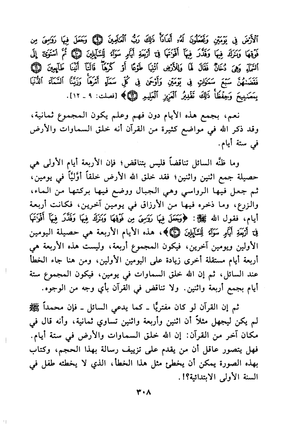 نعم بجمع هذه الأيام دون فهم وعلم يكون المجموع ثمانية, وقد ذكر الله في مواضع كثيرة من القرآن أنه خلق السماوات والأرض في ستة أيام وما ظنه السائل تناقضا فليس بتناقض؛ فإن الأربعة أيام الأولى هي حصيلة جمع اثنين واثنين؛ فقد خلق الله الأرض خلقا أوَّليَّا في يومين, ثم جعل فيها الرواسي وهي الجبال ووضع فيها بركتها من الماء، والزرع، وما ذخره فيها من الأرزاق في يومين آخرين, فكانت أربعة أيام، فقول الله سبحانه وتعالى: (وجعل فيها رواسي من فوقها وبارك فيها وقدر فيها أقواتها في أربعة أيام سواء للسائلين (، هذه الأيام الأربعة هي حصيلة اليومين الأولين ويومين آخرين, فيكون المجموع أربعة, وليست هذه الأربعة هي أربعة أيام مستقلة أخرى زيادة على اليومين الأولين.. ومن هنا جاء الخطأ عند السائل, ثم إن الله خلق السماوات في يومين, فيكون المجموع ستة أيام بجمع أربعة واثنين ولا تناقض في القرآن بأي وجه من الوجوه ثم إن القرآن لو كان مفتريَّا كما يدعي السائل- فإن محمدا (لم يكن ليجهل مثلا أن اثنين وأربعة واثنين تساوي ثمانية, وأنه قال في مكان آخر من القرآن إن الله خلق السماوات والأرض في ستة أيام فهل يتصور عاقل أن من يقدم على تزييف رسالة بهذا الحجم، وكتاب بهذه الصورة يمكن أن يخطئ مثل هذا الخطأ, الذي لا يخطئه طفل في السنة الأولى الابتدائية؟! ل