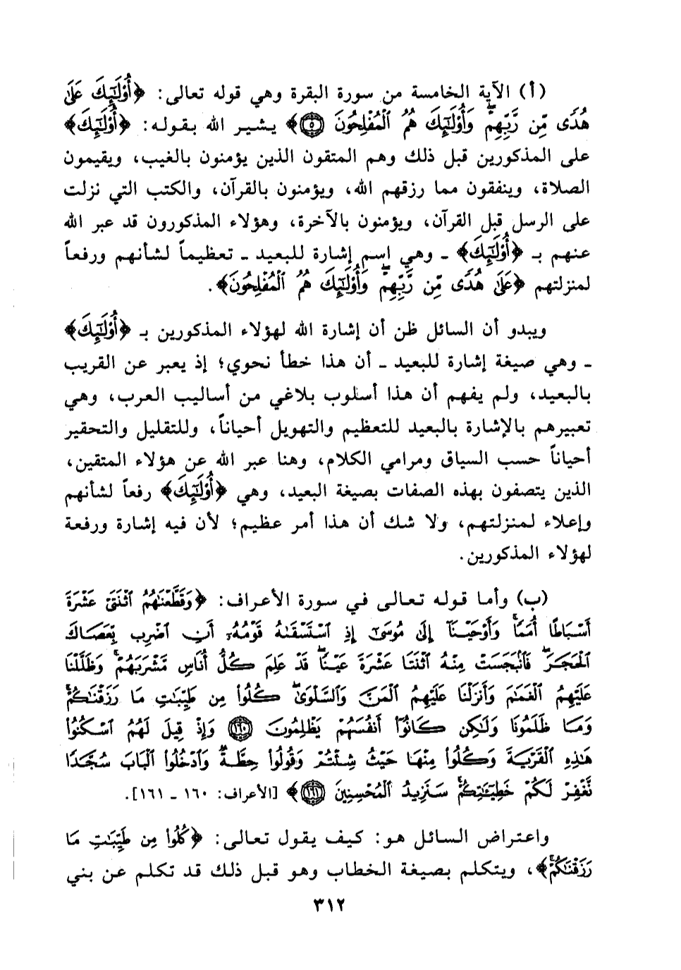 بـ (أولئك (وهي اسم إشارة للبعيد تعظيما لشأنهم ورفعا لمنزلتهم (على هدى من ربهم وأولئك هم المفلحون (ويبدو أن السائل ظن أن إشارة الله لهؤلاء المذكورين (بأولئك (- وهي صيغة إشارة للبعيد- أن هذا خطأ نحوي؛ إذ يعبر عن القريب بالبعيد، ولم يفهم أن هذا أسلوب بلاغي من أساليب العرب، وهي تعبيرهم بالإشارة بالبعيد للتعظيم والتهويل أحيانا، وللتقليل والتحقير أحيانا حسب السياق، ومرامي الكلام، وهنا عبر الله عن هؤلاء المتقين، الذين يتصفون بهذه الصفات بصيغة البعيد , وهي (أولئك (رفعا لشأنهم وإعلاء لمنزلتهم, ولا شك أن هذا أمر عظيم؛ لأن فيه إشارة ورفعة لهؤلاء المذكورين. ب) وأما قوله تعالى في سورة الأعراف: {وقطعناهم اثنتي عشرة أسباطا أمما، وأوحينا إلى موسى إذ استسقاه قومه أن اضرب بعصاك الحجر فانبجست منه اثنتا عشر عينا قد علم كل أناس مشربهم وظللنا عليهم الغمام وأنزلنا عليهم المن والسلوى كلوا من طيبات ما رزقناكم وما ظلمونا ولكن كانوا أنفسهم يظلمون} [الأعراف: 16] واعتراض السائل هو كيف يقول تعالى: (كلوا من طيبات ما رزقناكم (، ويتكلم بصيغة الخطاب وهو قبل ذلك قد تكلم عن بني