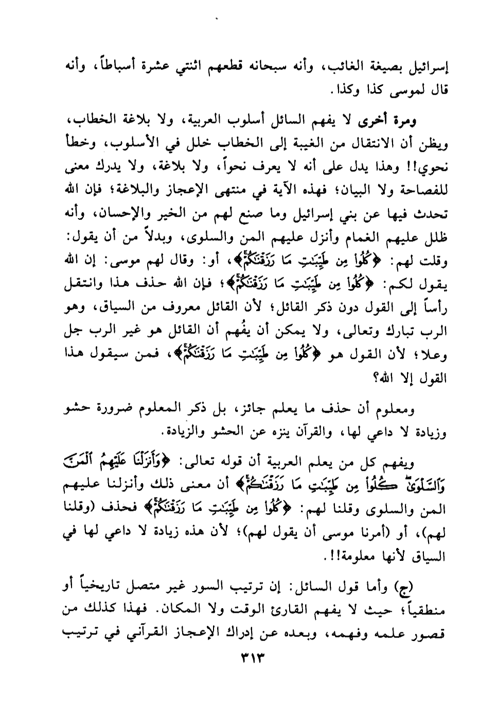 أو وقال لهم موسى: إن الله يقول لكم: (كلوا من طيبات ما رزقناكم (فإن الله حذف هذا وانتقل رأسا إلى القول دون ذكر القائل؛ لأن القائل معروف من السياق, وهو الرب تبارك وتعالى, ولا يمكن أن يفُهم أن القائل هو غير الرب جل وعلا, لأن القول هو (كلوا من طيبات ما رزقناكم (فمن سيقول هذا القول إلا الله؟ ومعلوم أن حذف ما يعلم جائز، بل ذكر المعلوم ضرورة حشو وزيادة لا داعي لها، والقرآن ينزه عن الحشو والزيادة. ويفهم كل من يعلم العربية أن قوله تعالى: (وأنزلنا عليهم المن والسلوى كلوا من طيبات ما رزقناكم (أن معنى ذلك وأنزلنا عليهم المن والسلوى وقلنا لهم: (كلوا من طيبات ما رزقناكم (فحذف (وقلنا لهم) ، أو (أمرنا موسى أن يقول لهم) لأن هذه زيادة لا داعي لها في السياق لأنها معلومة!! (ج) وأما قول السائل: إن ترتيب السور غير متصل تاريخيا أو منطقيا؛ حيث لا يفهم القارئ الوقت ولا المكان. فهذا كذلك من قصور علمه وفهمه، وبعده عن إدراك الإعجاز القرآني في ترتيب