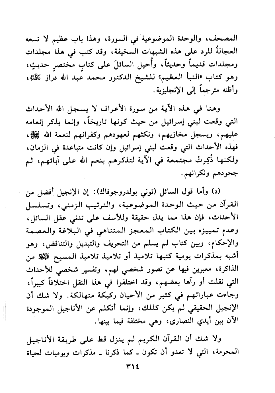 (د) وأما قول السائل (توني بولدروجوفاك) : إن الإنجيل أفضل من القرآن من حيث الوحدة الموضوعية, والترتيب الزمني، وتسلسل الأحداث, فإن هذا مما يدل حقيقة وللأسف على تدني عقل السائل, وعدم تمييزه بين الكتاب المعجز المتناهي في البلاغة والعصمة والإحكام، وبين كتاب لم يسلم من التحريف والتبديل والتناقض، وهو أشبه بمذكرات يوميها كتبها تلاميذ أو تلاميذ تلاميذ المسيح عليه السلام من الذاكرة, معبرين فيها عن تصور شخصي لهم، وتفسير شخصي للأحداث التي نقلت أو رآها بعضهم، وقد اختلفوا في هذا النقل اختلافا كبيرا، وجاءت عباراتهم في كثير من الأحيان ركيكة متهالكة. ولا شك الإنجيل الحقيقي لم يكن كذلك, وإنما أتكلم عن الأناجيل الموجودة الآن بين أيدي النصارى, وهي مختلفة فيما بينها. ولا شك أن القرآن الكريم لم ينزل قط على طريقة الأناجيل المحرفة ,التي لا تعدو أن تكون- كما ذكرنا- مذكرات ويوميات لحياة
