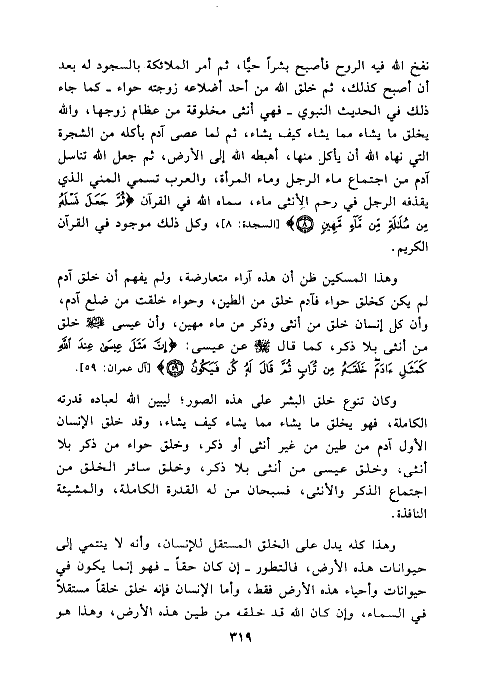 وكان تنوع خلق البشر على هذه الصور؛ ليبين الله لعباده قدرته الكاملة، فهو يخلق ما يشاء مما يشاء كيف يشاء، وقد خلق الإنسان الأول آدم من طين من غير أنثى أو ذكر، وخلق حواء من ذكر بلا أنثى، وخلق عيسى من أنثى بلا ذكر، وخلق سائر الخلق من اجتماع الذكر والأنثى، فسبحان من له القدرة الكاملة، والمشيئة النافذة, وهذا كله يدل على الخلق المستقل للإنسان, وأنه لا ينتمي إلى حيوانات هذه الأرض، فالتطور- إن كان حقا- فهو إنما يكون في حيوانات وأحياء هذه الأرض فقط, وأما الإنسان فإنه خلق خلقا مستقلا في السماء، وإن كان الله قد خلقه من طين هذه الأرض, وهذا هو