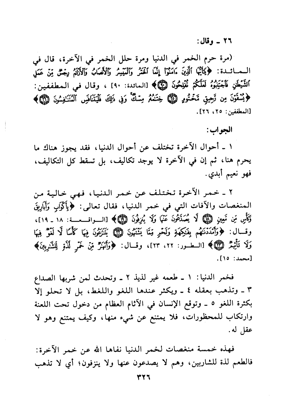 (مرة حرم الخمر في الدنيا ومرة حلل الخمر في الآخرة، قال في المائدة: {يَاأَيُّهَا الَّذِينَ آمَنُوا إِنَّمَا الْخَمْرُ وَالْمَيْسِرُ وَالْأَنصَابُ وَالْأَزْلَامُ رِجْسٌ مِنْ عَمَلِ الشَّيْطَانِ فَاجْتَنِبُوهُ لَعَلَّكُمْ تُفْلِحُونَ} [المائدة:90] ، وقال في المطففين: {يُسْقَوْنَ مِنْ رَحِيقٍ مَخْتُومٍ خِتَامُهُ مِسْكٌ وَفِي ذَلِكَ فَلْيَتَنَافَسِ الْمُتَنَافِسُونَ} [المطففين:25,26] .