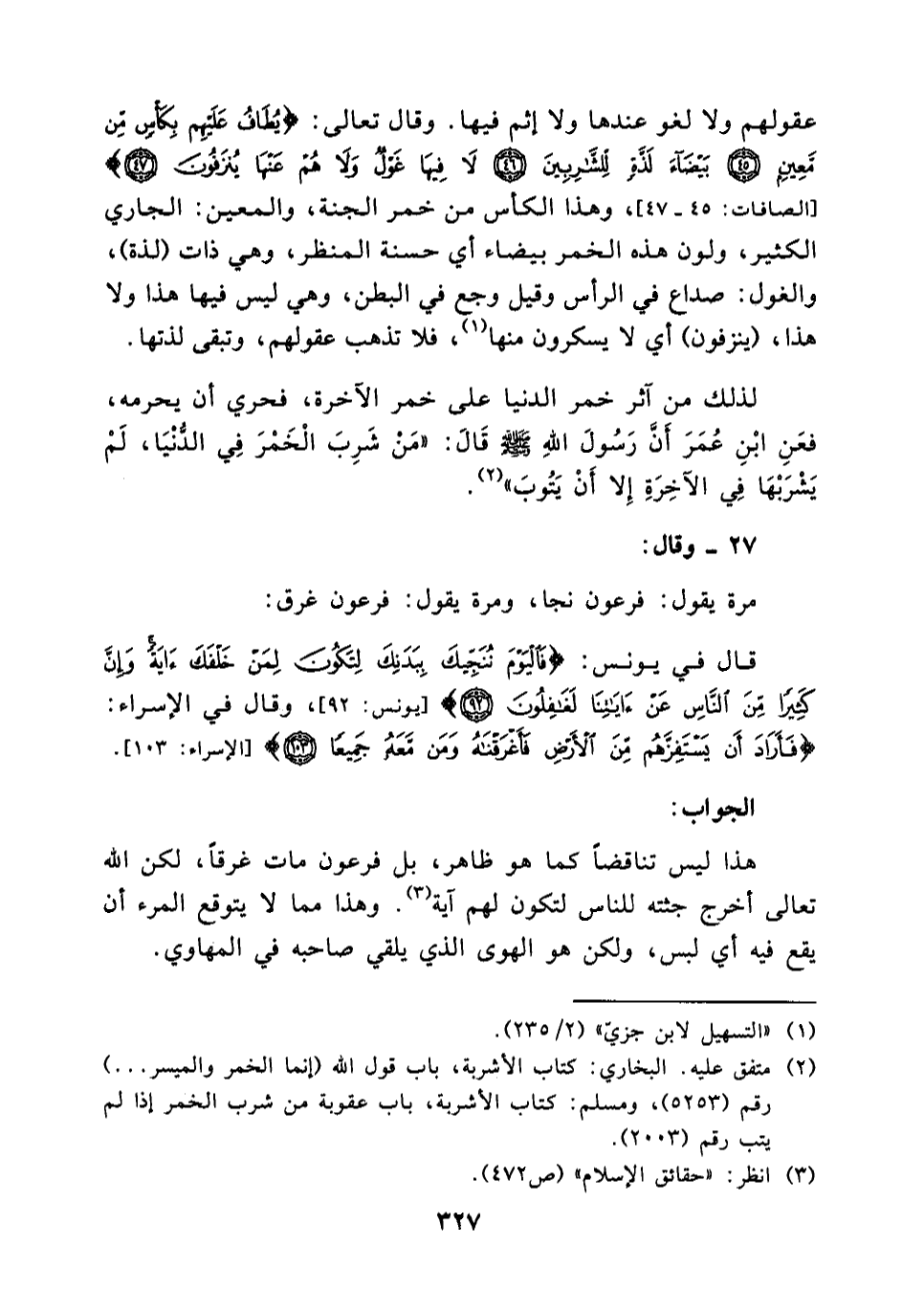 عقولهم ولا لغو عندها ولا أثم فيها. وقال تعالى: (يُطَافُ عَلَيْهِمْ بِكَأْسٍ مِنْ مَعِينٍ (45) بَيْضَاءَ لَذَّةٍ لِلشَّارِبِينَ (46) لاَ فِيهَا غَوْلٌ وَلاَ هُمْ عَنْهَا يُنزَفُونَ ( [الصافات: 45-47] ، وهذا الكأس من خمر الجنة، والمعين: الجاري الكثير، ولون هذه الخمر بيضاء أي حسنة المنظر، وهي ذات (لذة) ، والغول صداع في الرأس وقيل وجع في البطن وهي ليس فيها هذا ولا هذا، (ينزفون) أي لا يسكرون منها (¬1) ,فلا تذهب عقولهم, وتبقى لذتها.