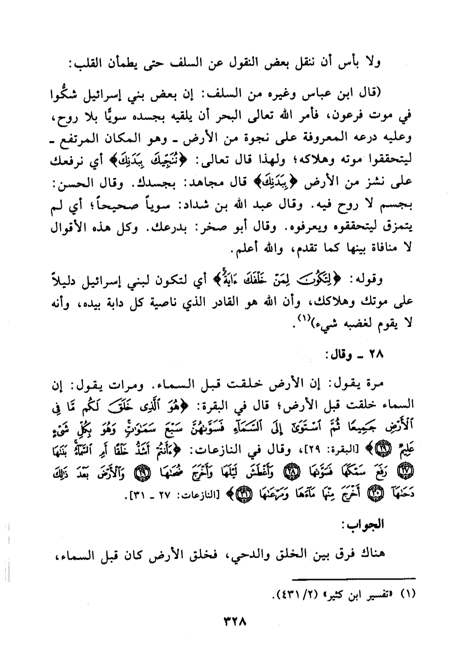 مرة يقول: إن الأرض خلقت قبل السماء. ومرات يقول: إن السماء خلقت قبل الأرض؛ قال في البقرة: {هُوَ الَّذِي خَلَقَ لَكُمْ مَا فِي الْأَرْضِ جَمِيعًا ثُمَّ اسْتَوَى إِلَى السَّمَاءِ فَسَوَّاهُنَّ سَبْعَ سَمَوَاتٍ وَهُوَ بِكُلِّ شَيْءٍ عَلِيمٌ} [البقرة:29] ، وقال في النازعات: (أأنْتُمْ أَشَدُّ خَلْقًا أَمِ السَّمَاءُ بَنَاهَا (*) رَفَعَ سَمْكَهَا فَسَوَّاهَا (*) وَأَغْطَشَ لَيْلَهَا وَأَخْرَجَ ضُحَاهَا (*) وَالْأَرْضَ بَعْدَ ذَلِكَ دَحَاهَا (*) أخرج منها ماءها مرعها ( [النازعات:27-30] .
