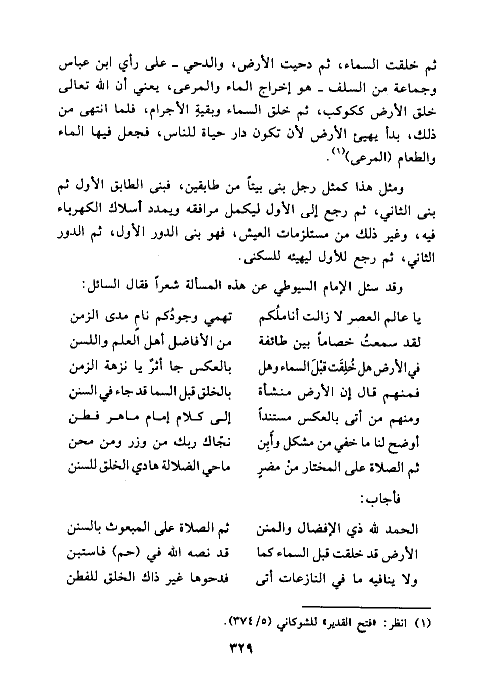 م خلقت السماء ,ثم دحيت الأرض، والدحي - على رأي ابن عباس وجماعة من السلف - هو إخراج الماء والمرعى، يعني أن الله تعالى خلق الأرض ككوكب، ثم خلق السماء وبقيتِ الأجرام، فلما انتهى من ذلك، بدأ يهيئ الأرض لأن تكون دار حياة للناس، فجعل فيها الماء والطعام (المرعى) (¬1) ، ومثل هذا كمثل رجل بنى بيتا من دورين , فبنى الدور الأول ثم بنى الثاني، ثم رجع إلى الأول ليكمل مرافقه ويمدد أسلاك الكهرباء فيه ,وغير ذلك من مستلزمات العيش، فهو بنى الدور الأول، ثم الدور الثاني , ثم رجع للأول ليهيئه للسكنى.