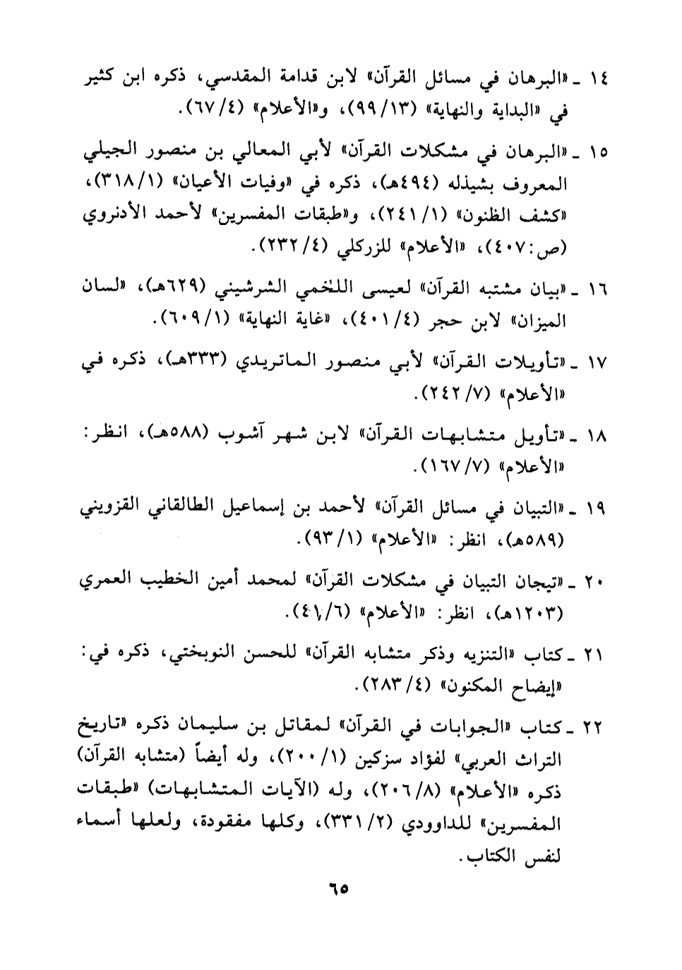 23-كتاب "الجوابات في القرآن" ذكره "تاريخ التراث العربي" لفؤاد سزكين (1/200) .، لمقاتل بن سليمان، وله أيضا (متشابه القرآن) ذكره " الأعلام " (8/206) . وله (الآيات المتشابهات) "طبقات المفسرين "للداوودي (2/331) . وكلها مفقودة، ولعلها أسماء لنفس الكتاب.