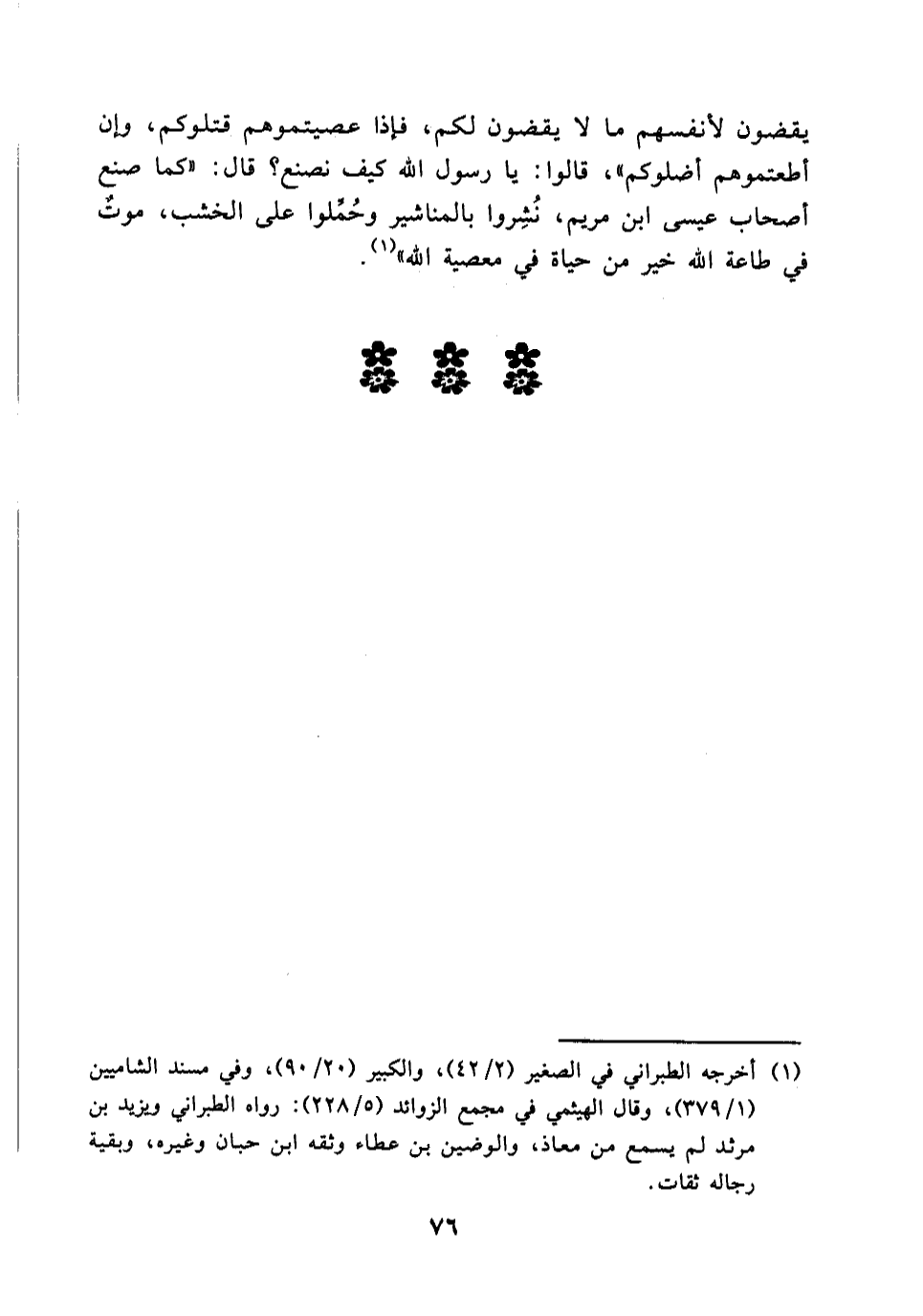 يقضون لأنفسهم مالا يقضون لكم، فإذا عصيتموهم قتلوكم، وإن أطعتموهم أضلوكم، قالوا: يا رسول الله كيف نصنع؟ قال: كما صنع أصحاب عيسى ابن مريم نشروا بالمناشير، وحملوا على الخشب، موتُُ في طاعة الله خير من حياة في معصية الله» (¬1) .