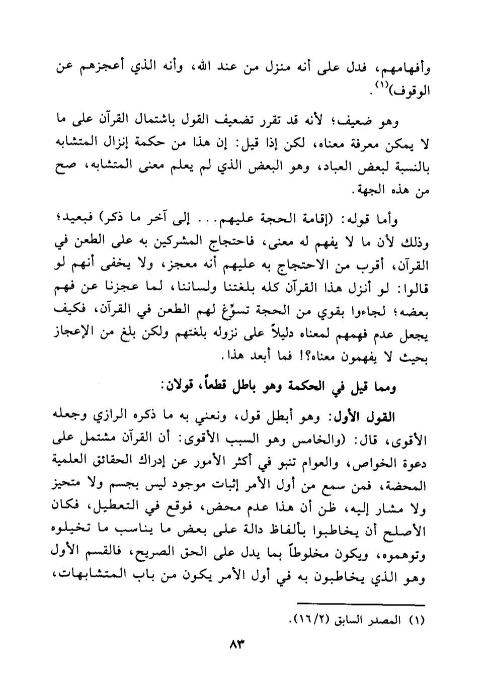 الأول: وهو أبطل قول، ونعني به ما ذكره الرازي وجعله الأقوى، قال: (والخامس وهو السبب الأقوى: أن القرآن مشتمل على دعوة الخواص، والعوام تنبو في أكثر الأمور عن إدراك الحقائق العلمية المحضة، فمن سمع من أول الأمر إثبات موجود ليس بجسم ولا متحيز ولا مشار إليه، ظن أن هذا عدم محض، فوقع في التعطيل، فكان الأصلح أن يخاطبوا بألفاظ دالة على بعض ما يناسب ما تخيلوه وتوهموه، ويكون مخلوطاً بما يدل على الحق الصريح، فالقسم الأول وهو الذي يخاطبون به في أول الأمر يكون من باب المتشابهات،