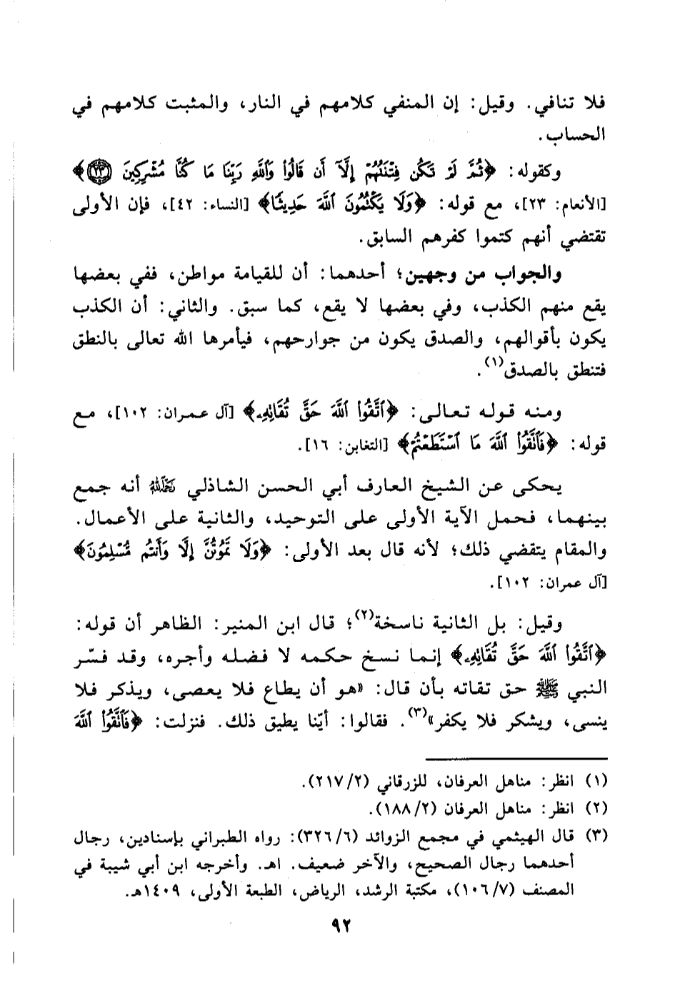 ومنه قوله تعالى: {اتقوا الله حق تقاته} [آل عمران: 102] ، مع قوله: {فاتقوا الله ما استطعتم} [التغابن: 16] ، يحكى عن الشيخ العارف أبي الحسن الشاذلي، رحمه الله، أنه جمع بينهما فحمل الآية الأولى على التوحيد، والثانية على الأعمال، والمقام يقتضي ذلك؛ لأنه قال بعد الأولى (ولا تموتن إلا وأنتم مسلمون (.