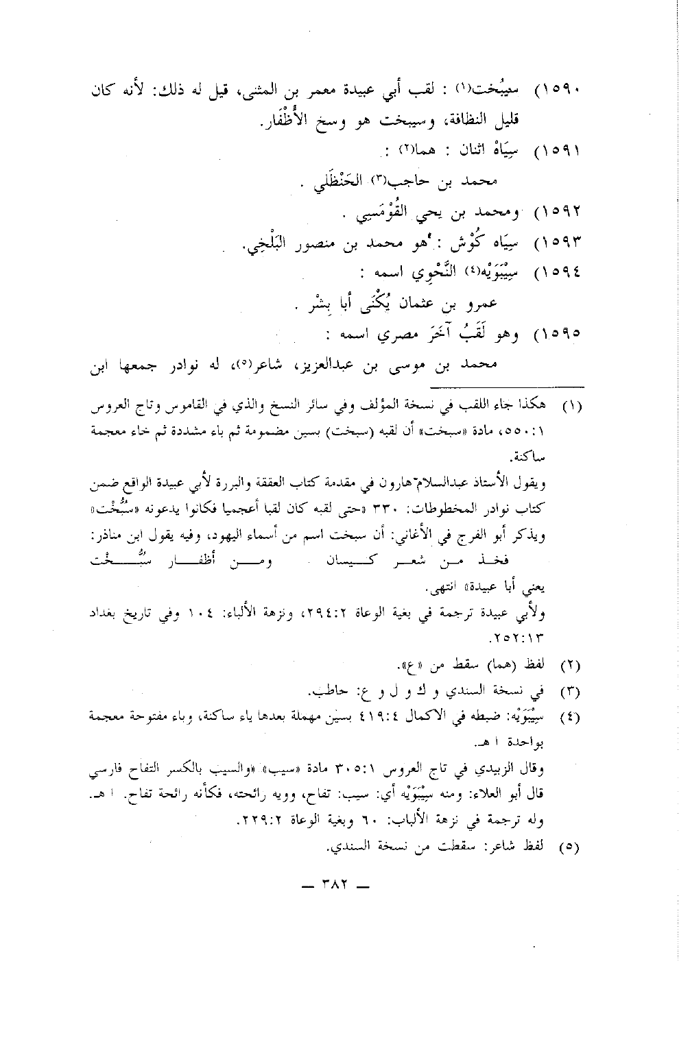 1590 - سيبخت لقب أبي عُبَيْدَة معمر بن الْمثنى قيل لَهُ ذَلِك لِأَنَّهُ كَانَ قَلِيل النَّظَافَة وسيبخت هُوَ وسخ الْأَظْفَار
