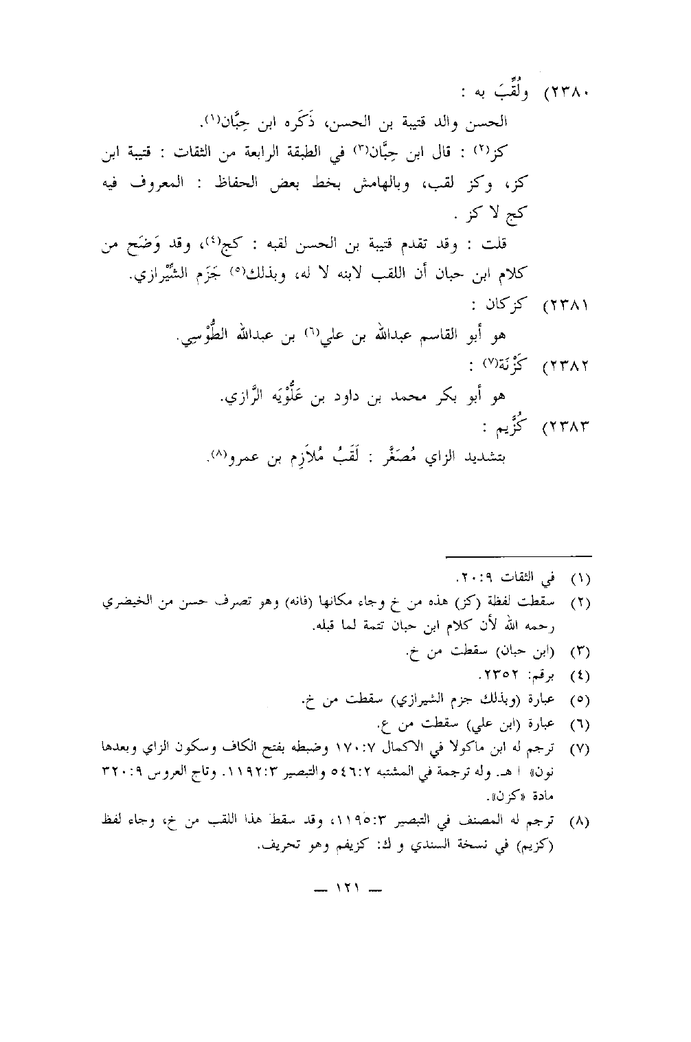 قلت وَقد تقدم قُتَيْبَة بن الْحسن لقبه كج وَقد وضح من كَلَام ابْن حبَان أَن اللقب لِابْنِهِ لَا لَهُ وَبِذَلِك جزم الشِّيرَازِيّ